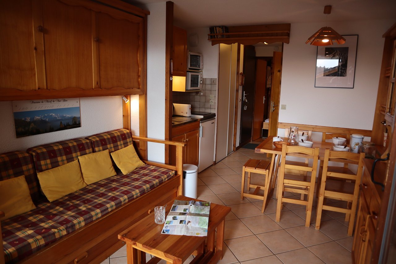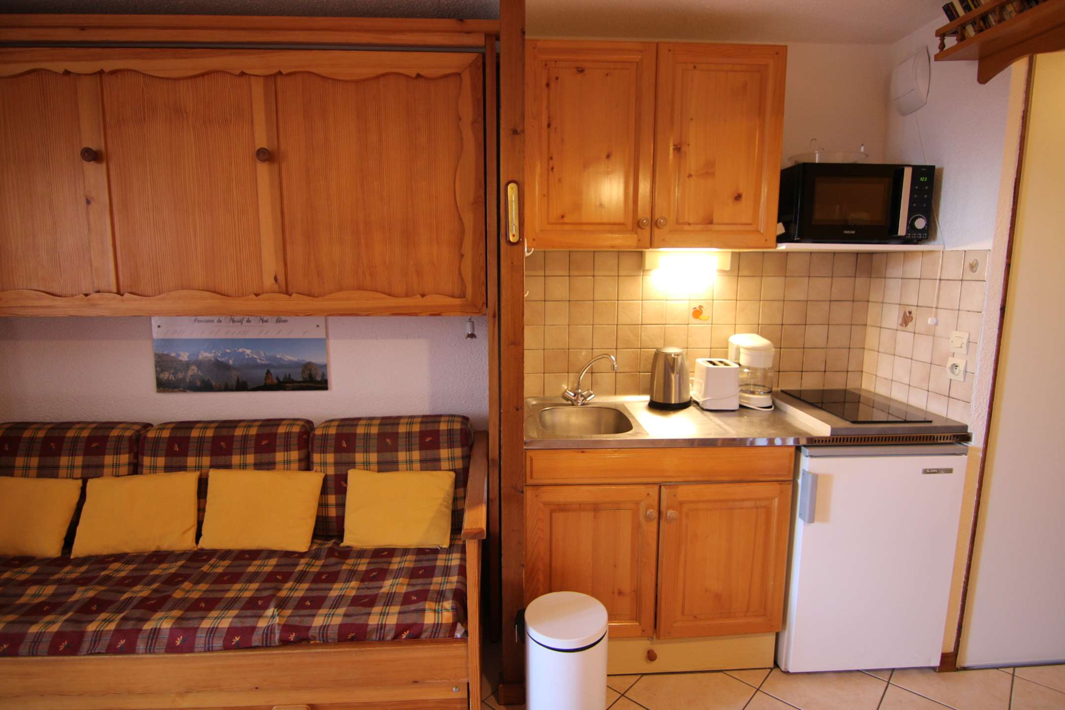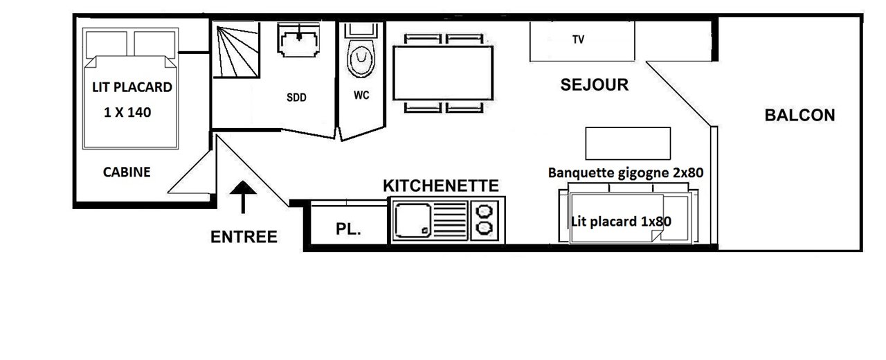L'appartement se compose d'un séjour avec une banquette gigogne 2x80, un lit superposé rabattable 80 (NB: le lit supérieur d'un lit superposé est interdit aux - 6 ans) et une kitchenette équipée ouverte, d'une cabine avec un lit 140 rabattable, d'une salle d'eau et WC séparé.