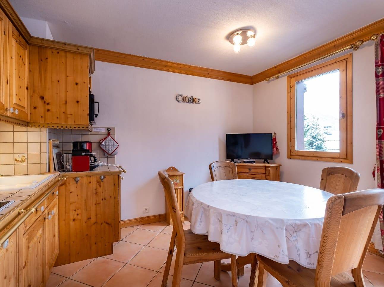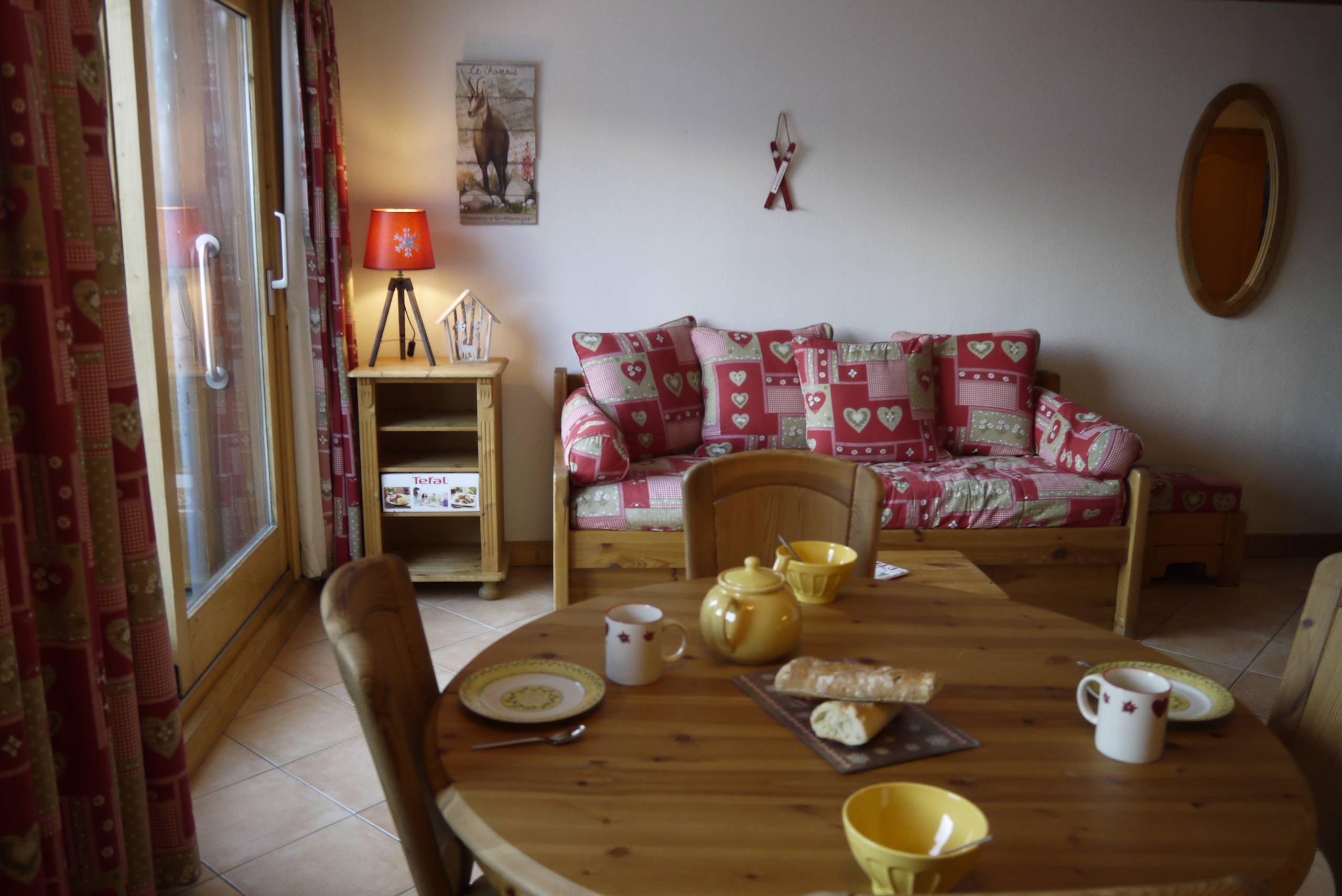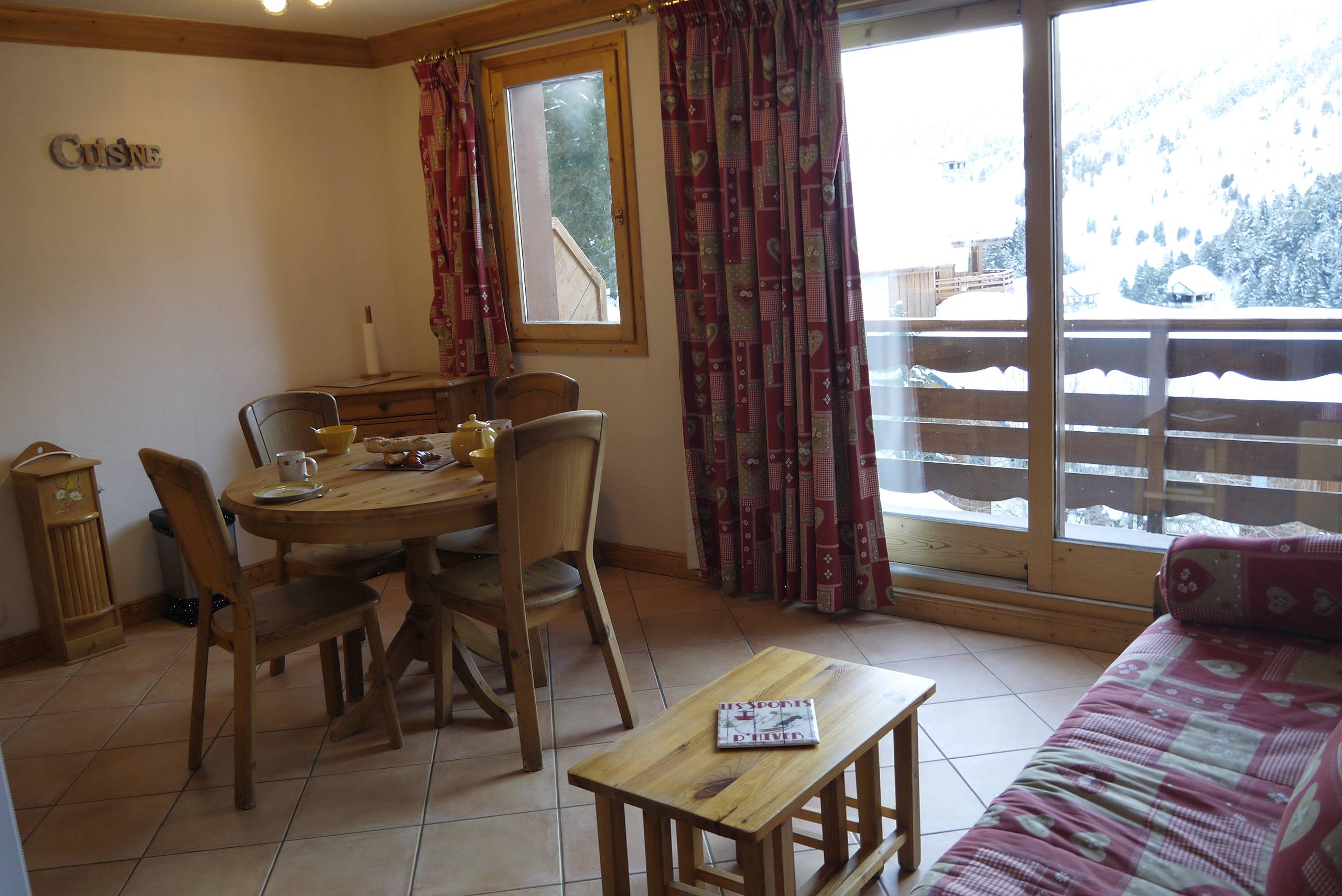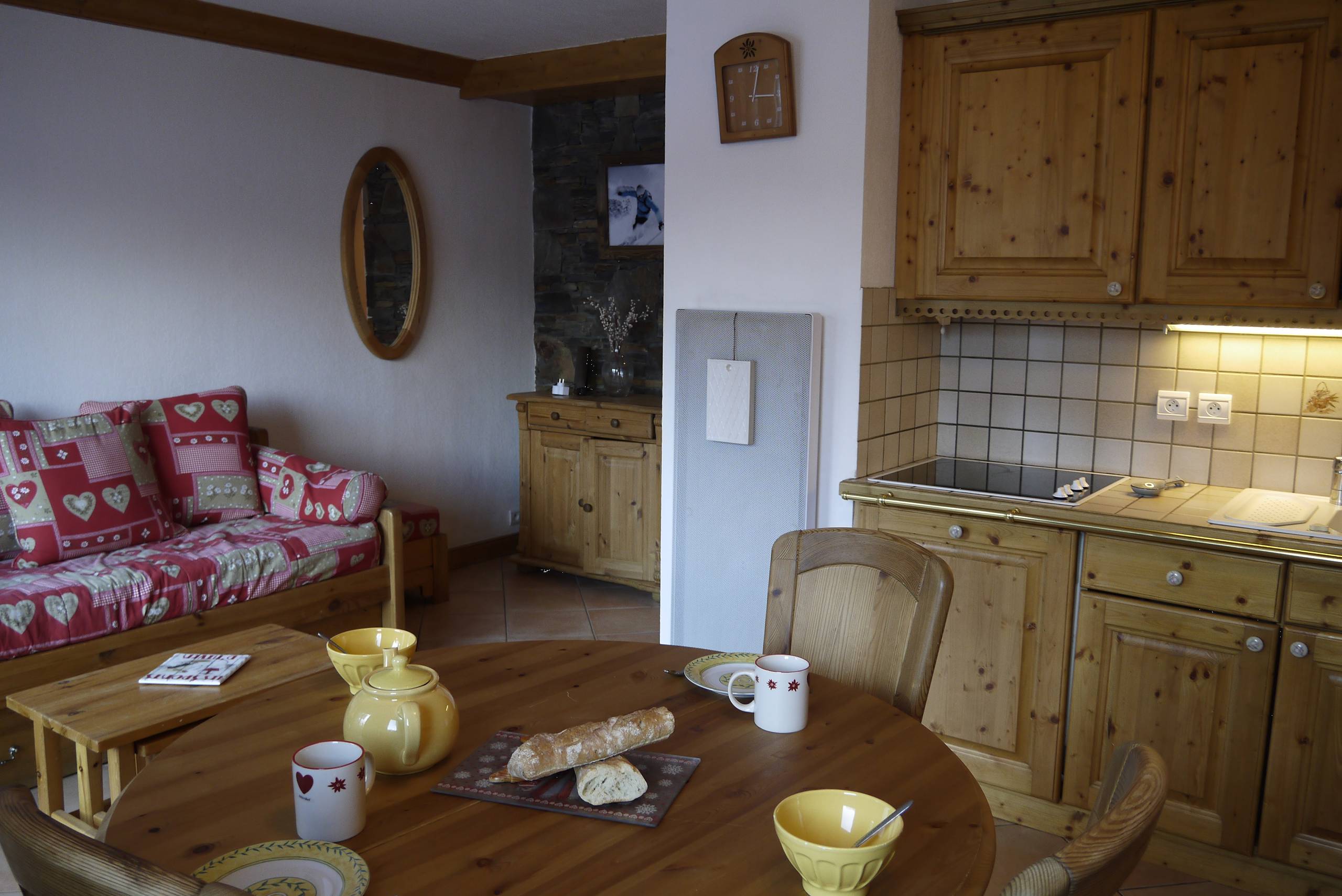 DESCRIPTION DE L'APPARTEMENT : Hall d'entrée, une chambre double, une chambre cabine pour 2 personnes, une salle de bains, un wc séparé, un séjour ouvrant sur un balcon exposé sud, cuisine ouverte. Casier à skis dans la résidence (situé dans l'entrée de la résidence). Appartement non Fumeur / Animaux non acceptés