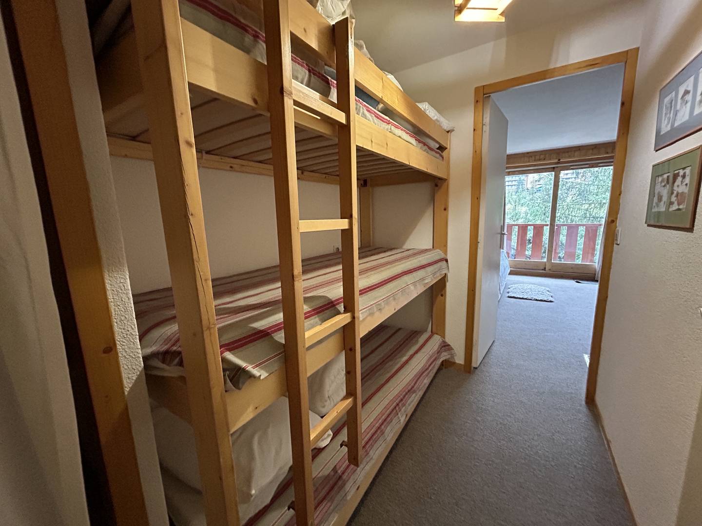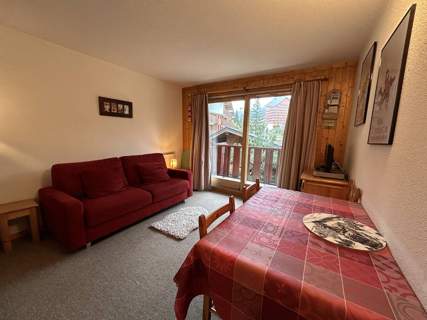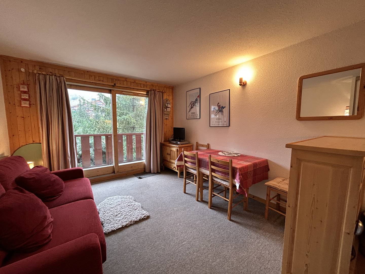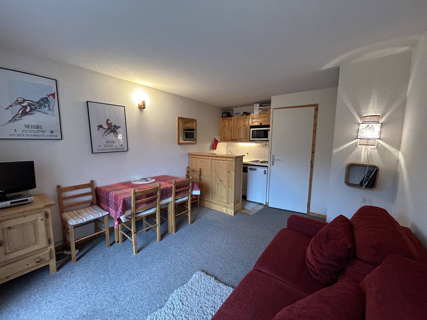 Studio avec un canapé double (140x190). Cuisine ouverte sur le séjour équipée de plaques électriques, four, micro-ondes, lave vaisselle, balcon avec jolie vue. Un coin montagne avec 2 lits superposés, salle de bain et wc séparé.