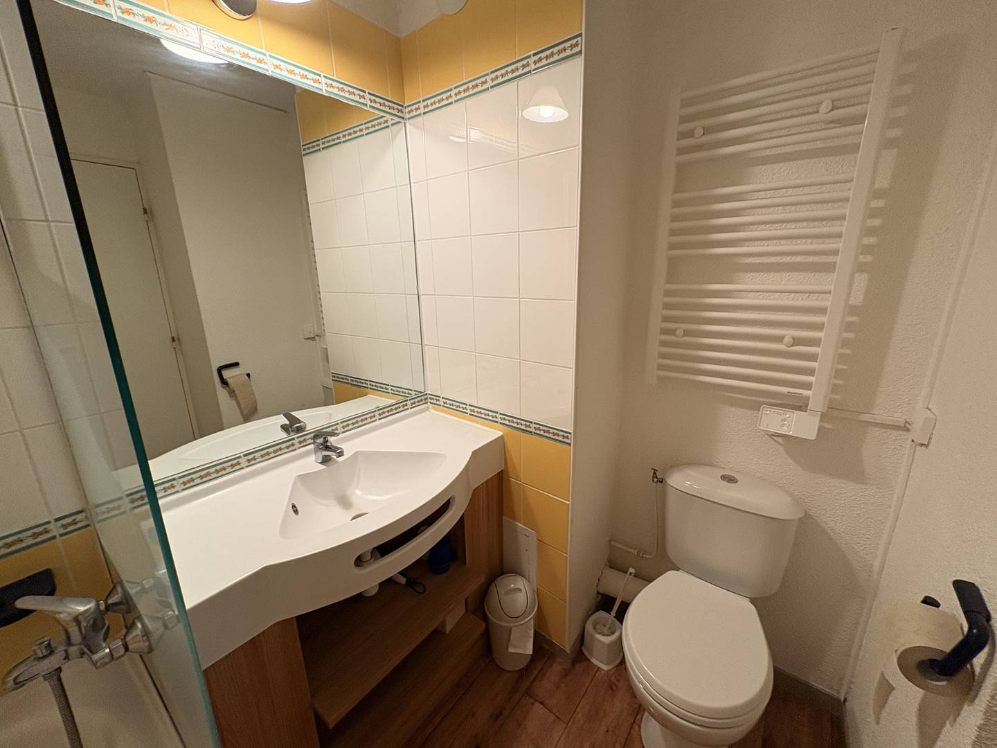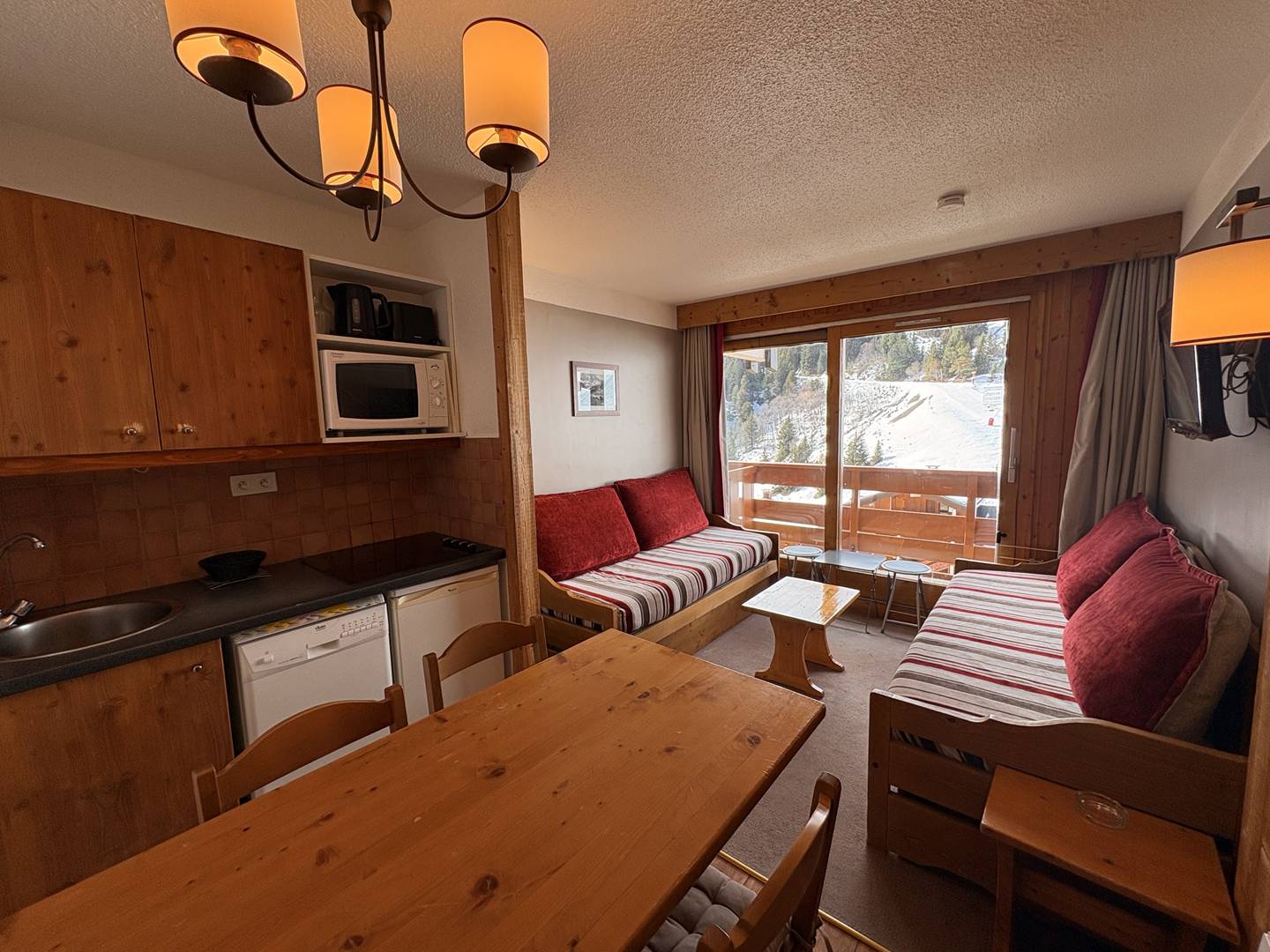 Le séjour lumineux, agrémenté d'un balcon accueillant, dispose de deux confortables banquettes-lits (80 x 190) et d'une télévision pour vos moments de détente. La kitchenette est entièrement équipée avec des plaques vitrocéramiques, un micro-ondes grill, un lave-vaisselle, un réfrigérateur, ainsi qu'une cafetière et une bouilloire pour préparer vos boissons chaudes. La chambre principale est dotée d'un lit double spacieux (140 x 190), idéal pour des nuits reposantes. La salle de bains, fonctionnelle, comprend des toilettes. Vous bénéficierez également d'un casier à skis et d'un ascenseur au sein de la résidence. L'appartement est situé au 9ème étage et offre une agréable exposition Ouest. Veuillez noter que cet appartement est non-fumeur et les animaux ne sont pas admis.