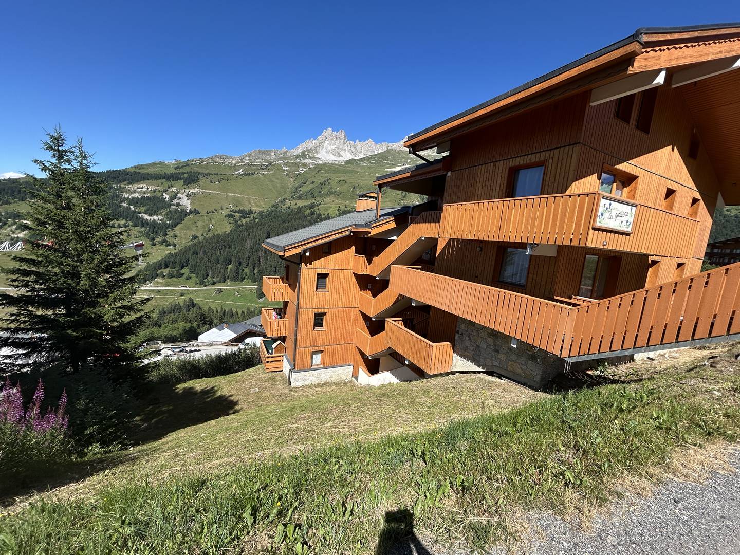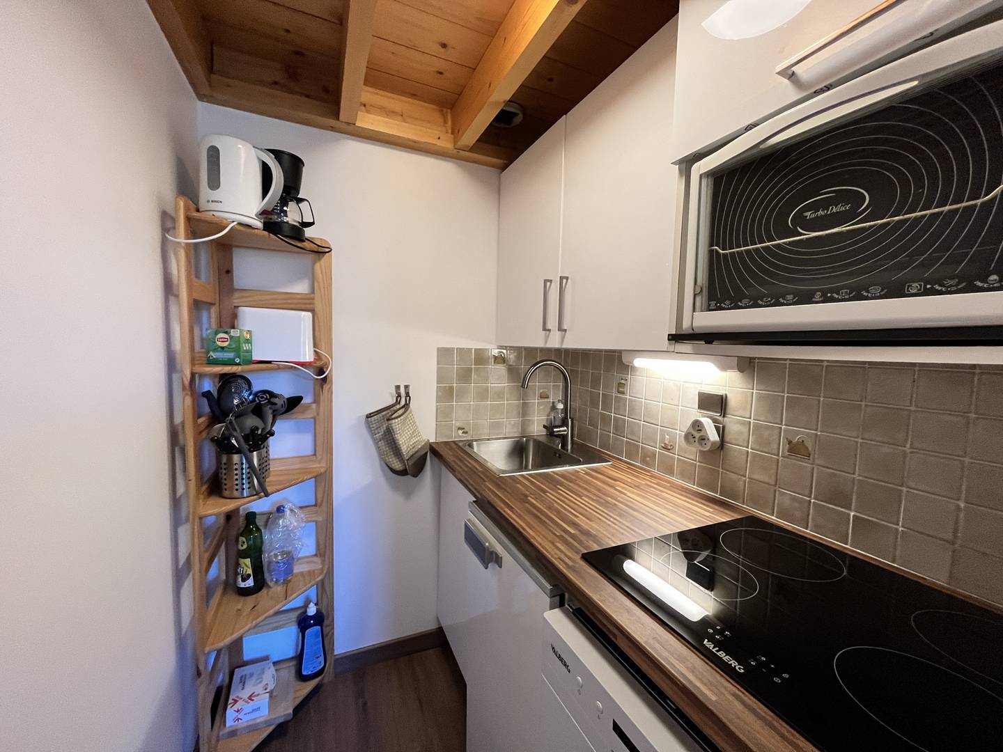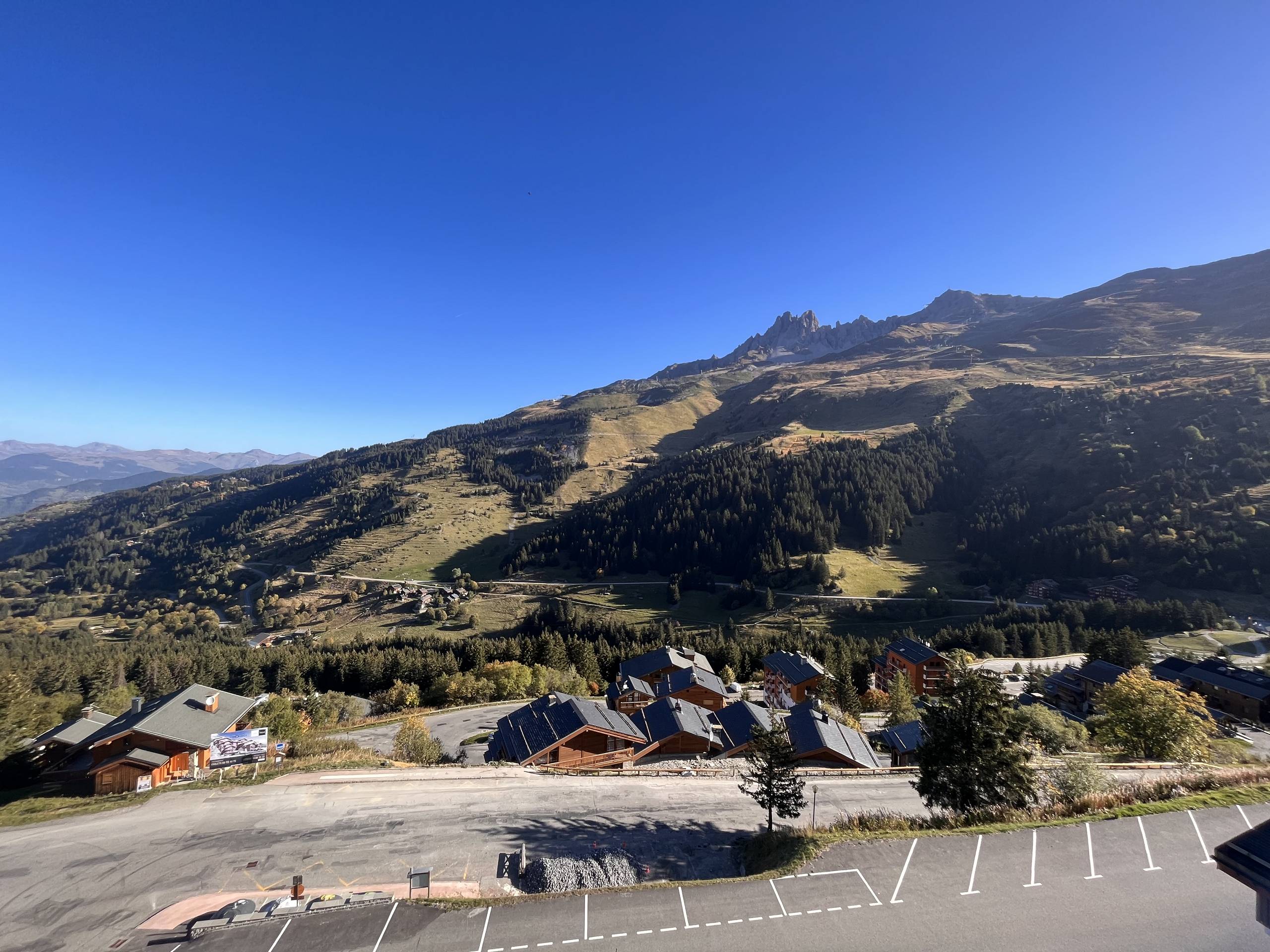 Le séjour ouvre sur un balcon bénéficiant d'une vue panoramique allant de Méribel à l'Aiguille du Fruit, avec la Saulire juste en face. Kitchenette équipée avec Lave Vaisselle, plaques électriques (x4), four, bouilloire et cafetière. Une salle de bains avec baignoire, et un WC indépendant. La cheminée de l'appartement n'est pas utilisable. Casier à skis dans la résidence.