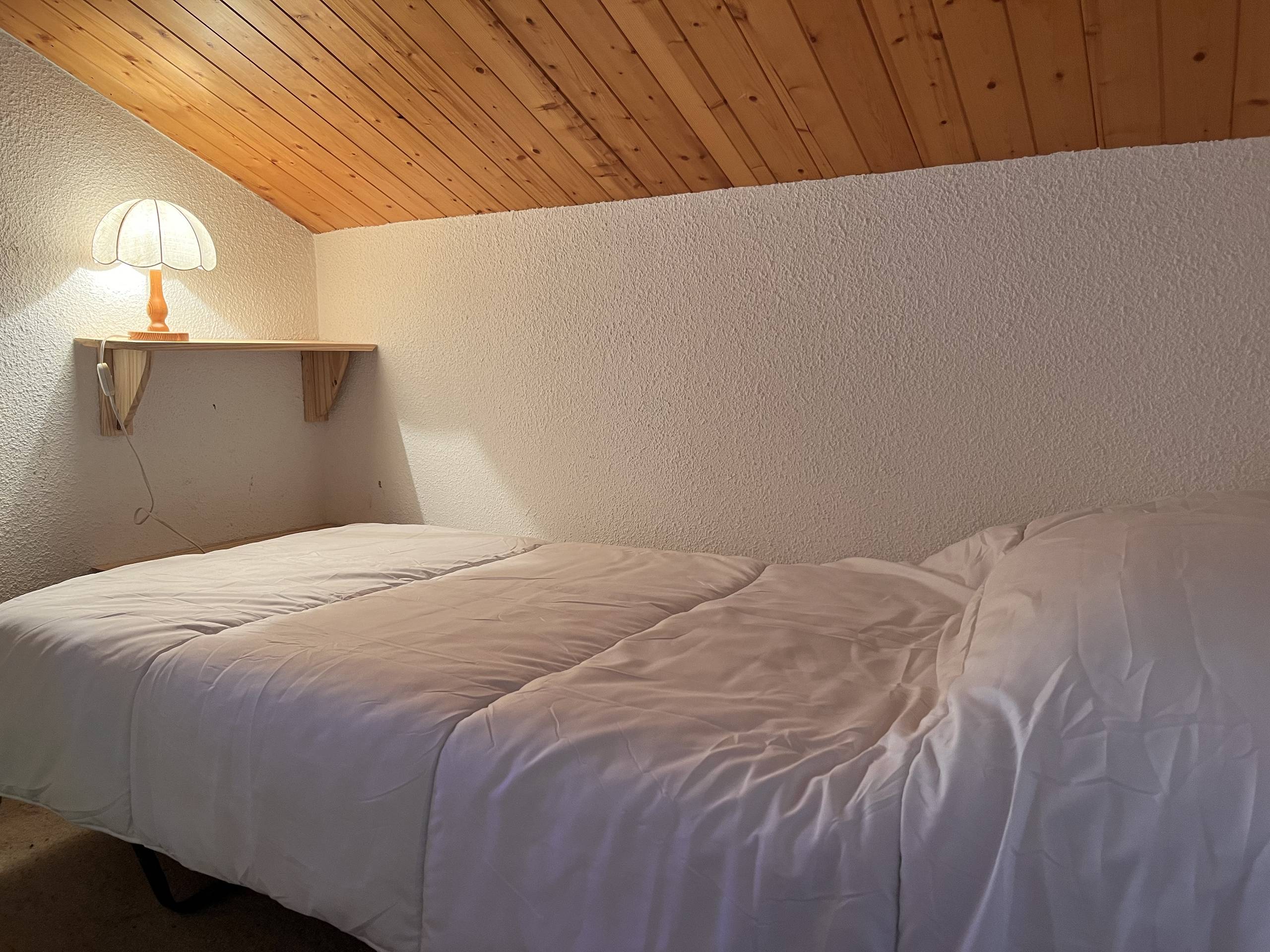 Il est composé d'une entrée, d'une chambre mansardée (hauteur minimum 110cm) avec un lit simple, d'une seconde chambre également en sous pente (hauteur minimum 110cm) avec un lit double et d'un espace mezzanine ouvert très mansardée (hauteur max 140cm et minimum 40cm au niveau des pieds) accessible par une échelle de meunier (non adapté aux enfants) disposant d'un lit double. L'espace mezzanine ne peut être considéré que pour un couchage d'appoint.