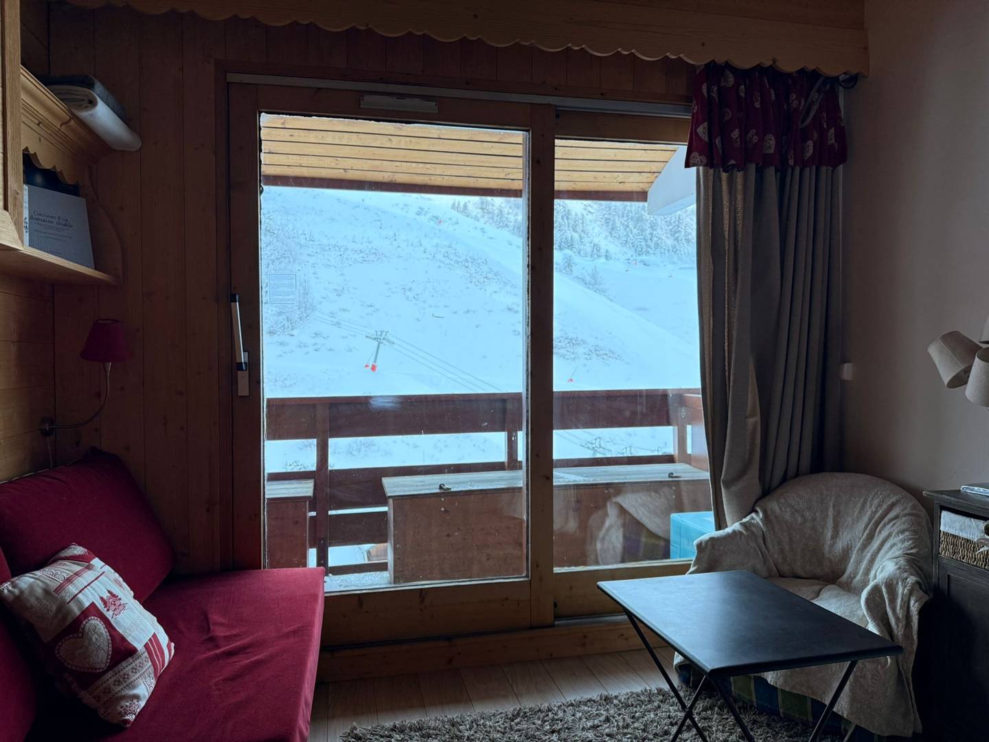 Niveau + 1: une chambre mezzanine (non fermée et sans fenêtre) très mansardée (hauteur mini 80cm au pied du lit). Une chambre mansardée avec un lit double (140x190) et velux. Une salle de bain avec baignoire (pas de wc). Casier à skis et ascenseur dans la résidence.