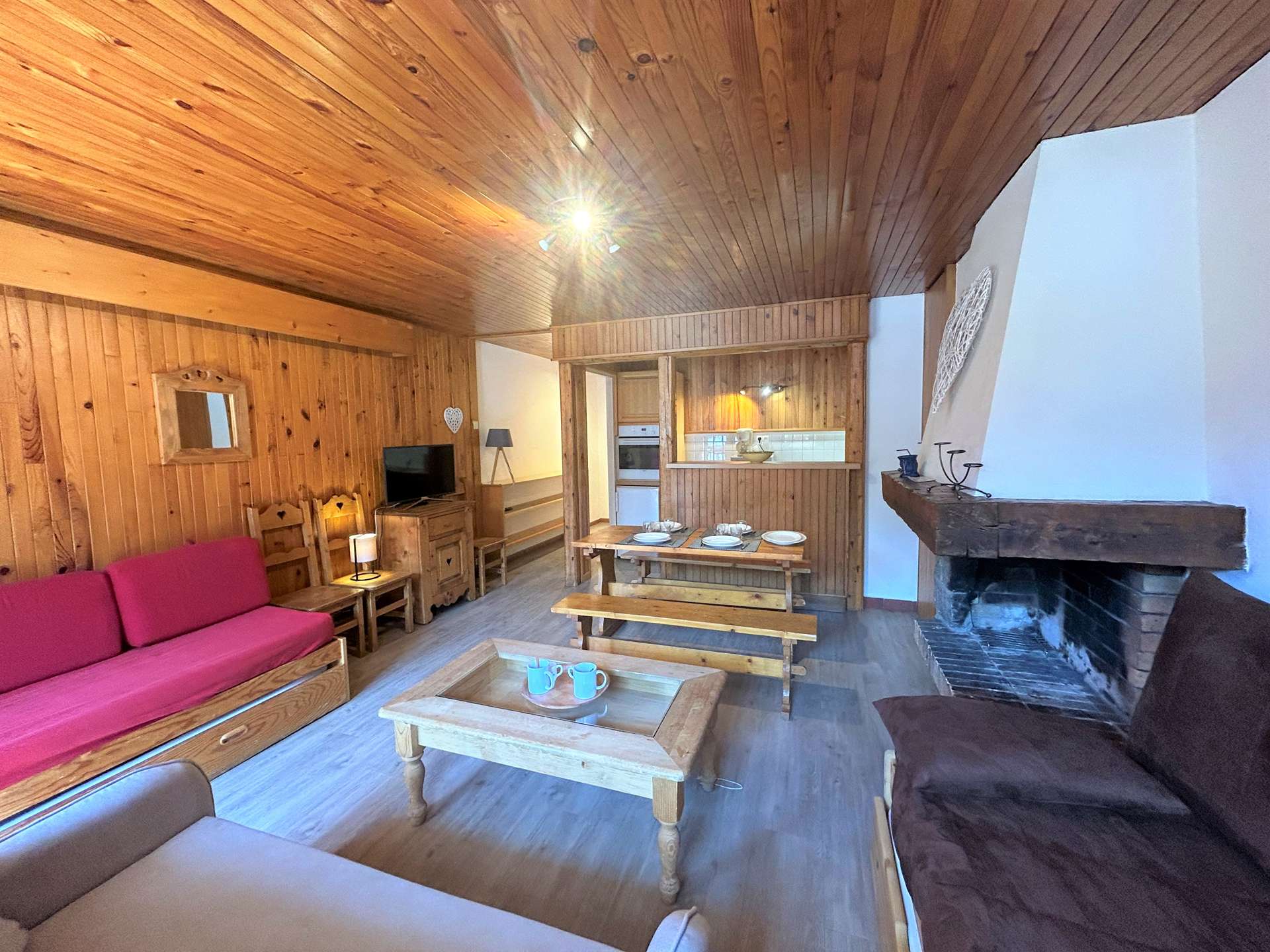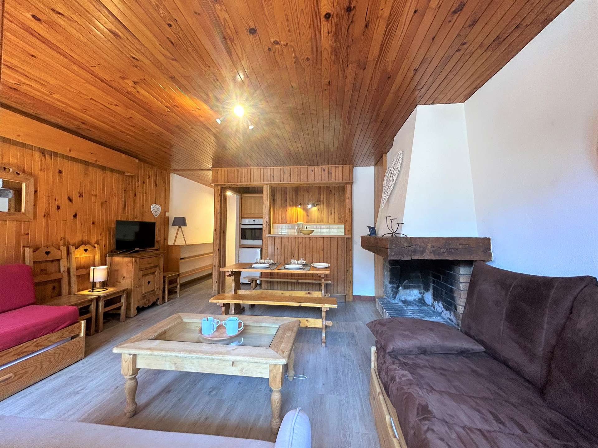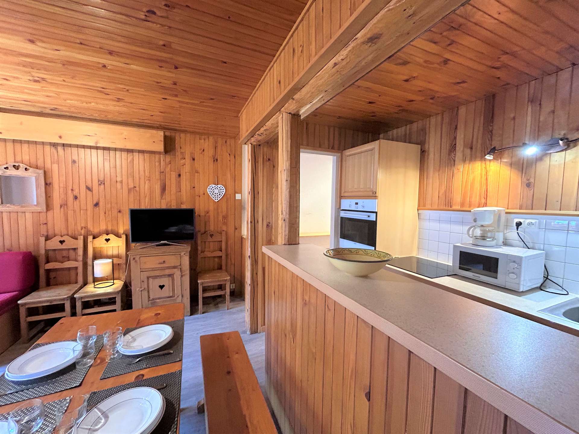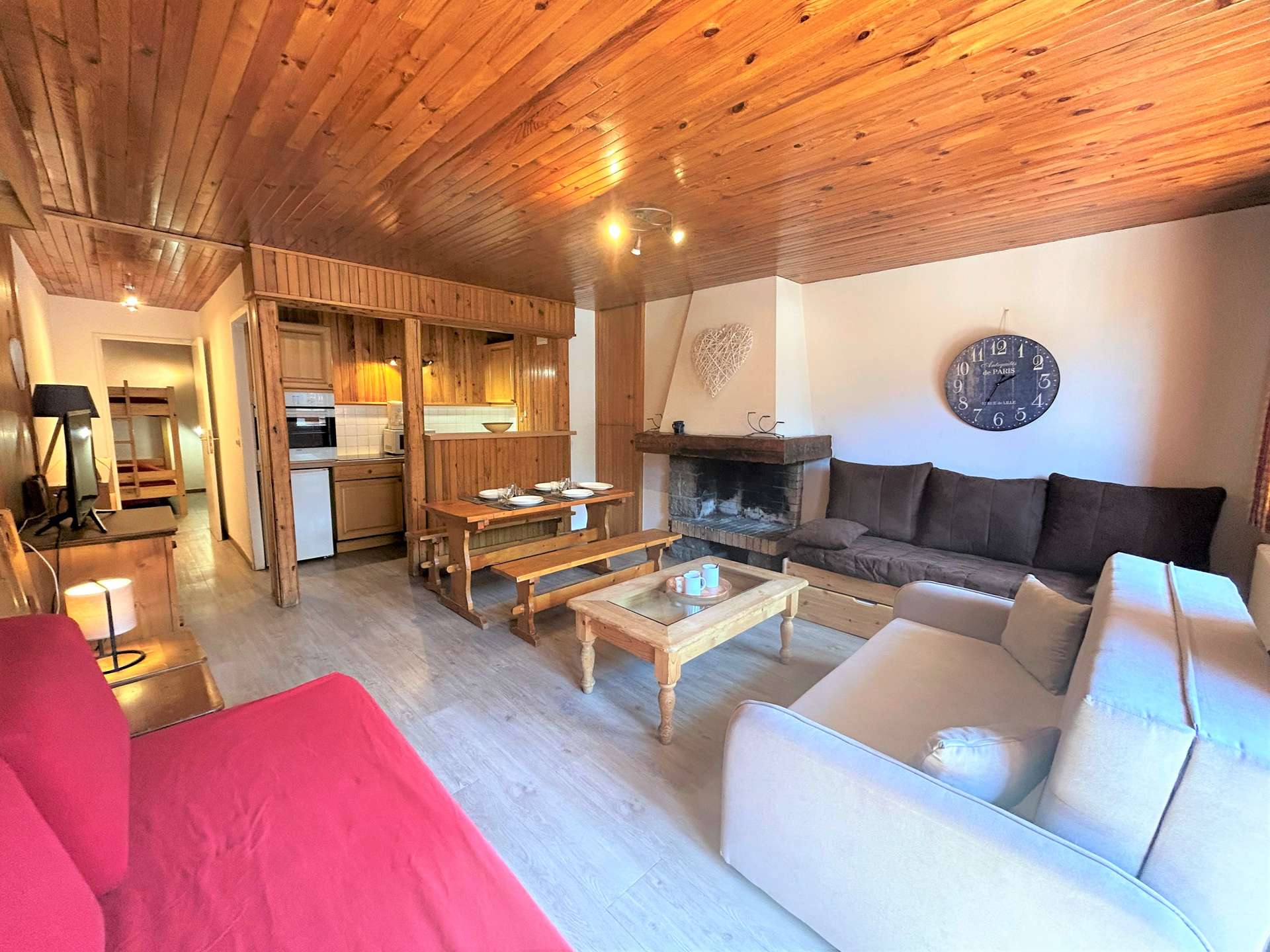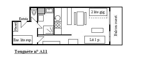 Cet appartement à la neige situé au 2ème étage, sans ascenseur, comprend une cuisine équipée ouverte sur le séjour donnant sur un balcon Ouest avec 1 ensemble de lits gigognes relevables, 1 canapé 2 places et 1 télévision, 1 entrée avec 1 ensemble de lits superposés, 1 salle d'eau et un WC indépendant. La cheminée ne peut pas être utilisée.
