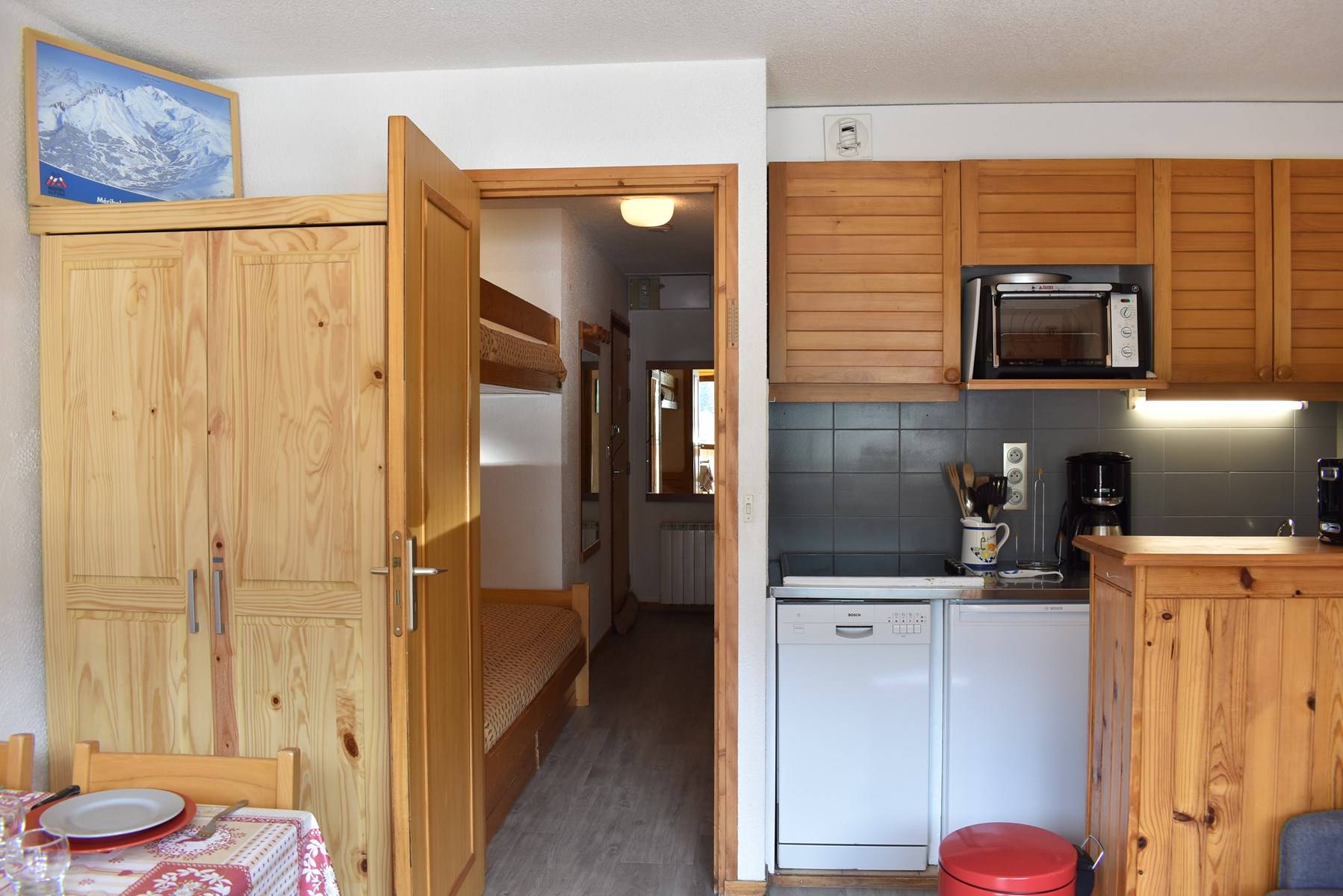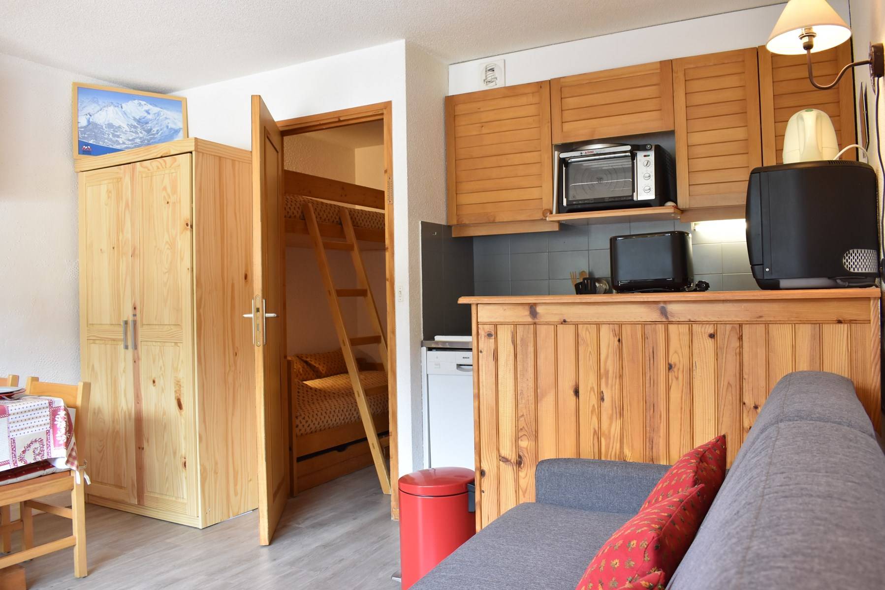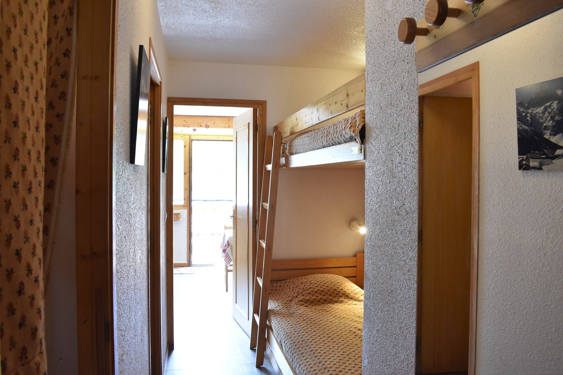 Ce studio à la montagne situé au 1er étage sans ascenseur, comprend 1 petite cuisine équipée avec lave vaisselle ouverte sur le séjour, un canapé lit 140 et une télévision, 1 salle de bain avec wc, 1 ensemble de lits superposés dans le couloir de l'entrée.