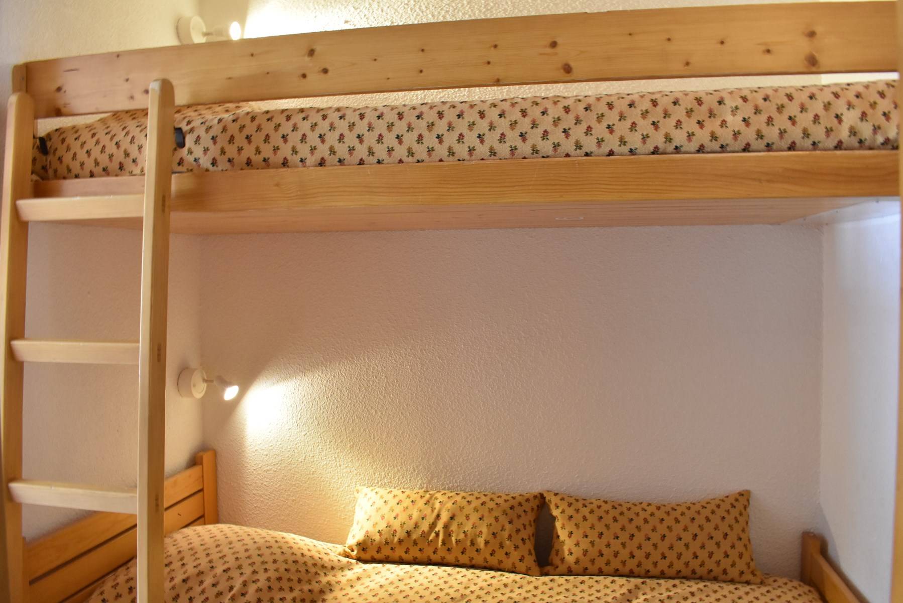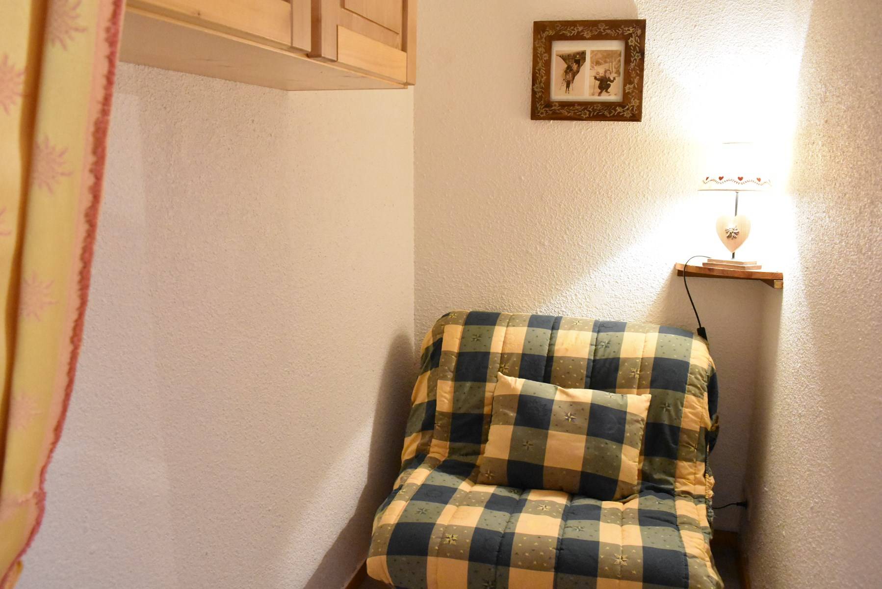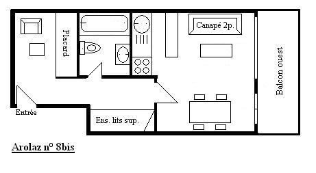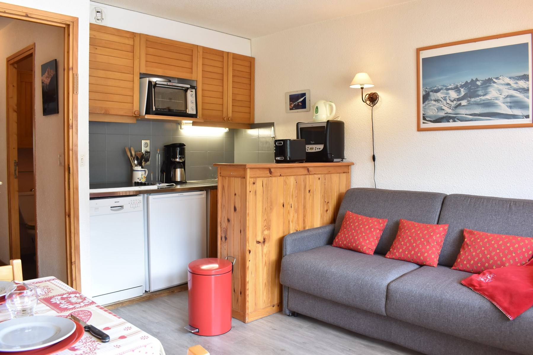 Ce studio à la montagne situé au 1er étage sans ascenseur, comprend 1 petite cuisine équipée avec lave vaisselle ouverte sur le séjour, un canapé lit 140 et une télévision, 1 salle de bain avec wc, 1 ensemble de lits superposés dans le couloir de l'entrée.