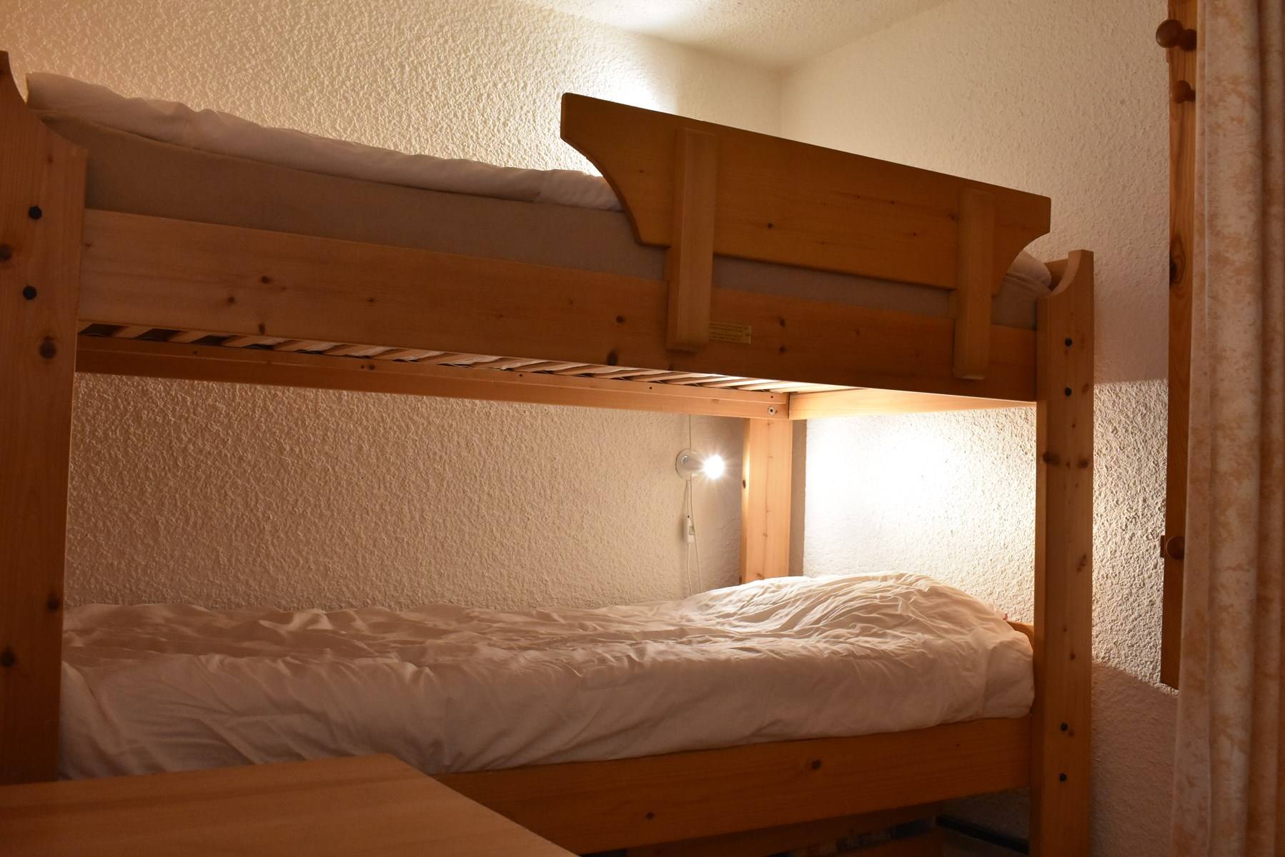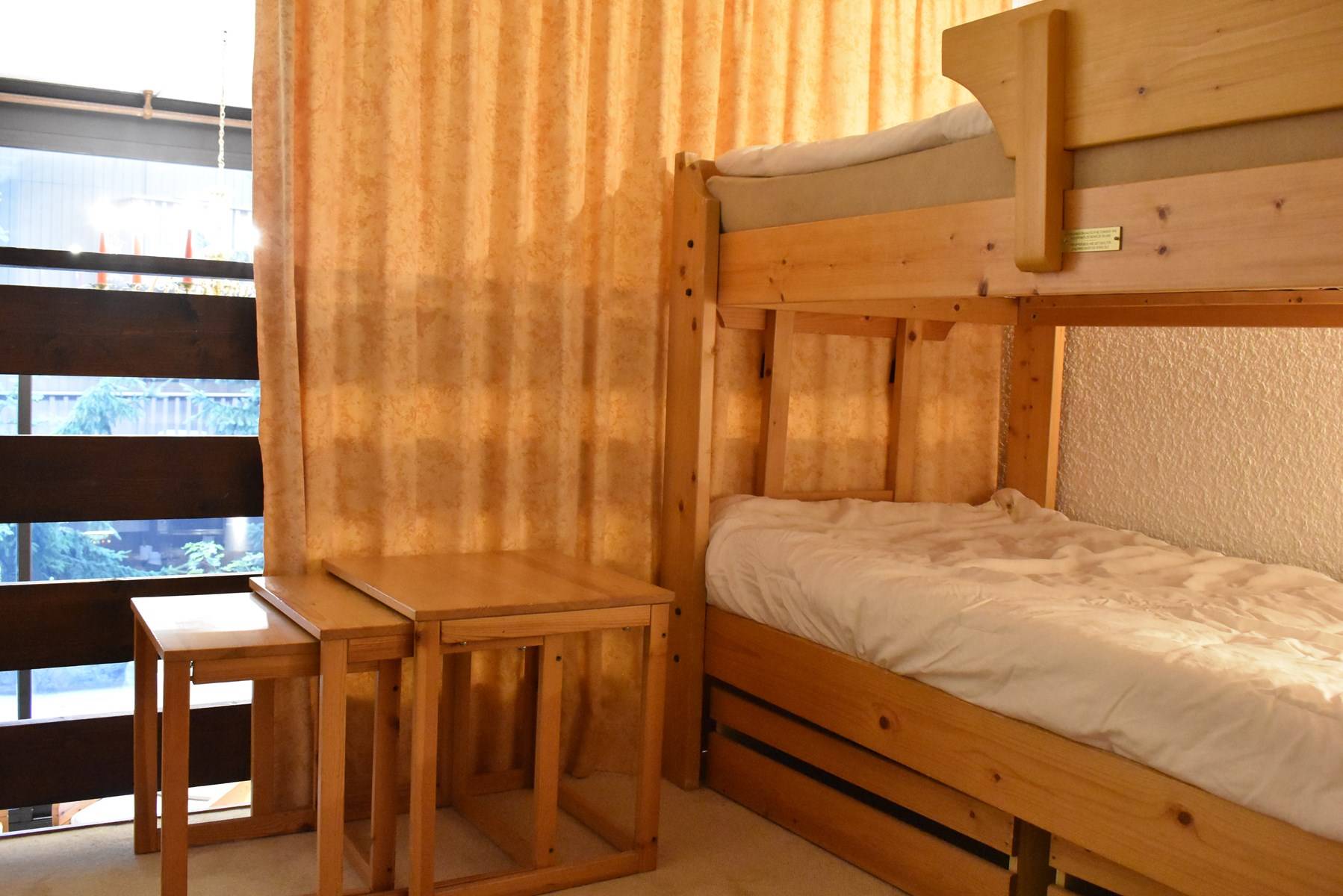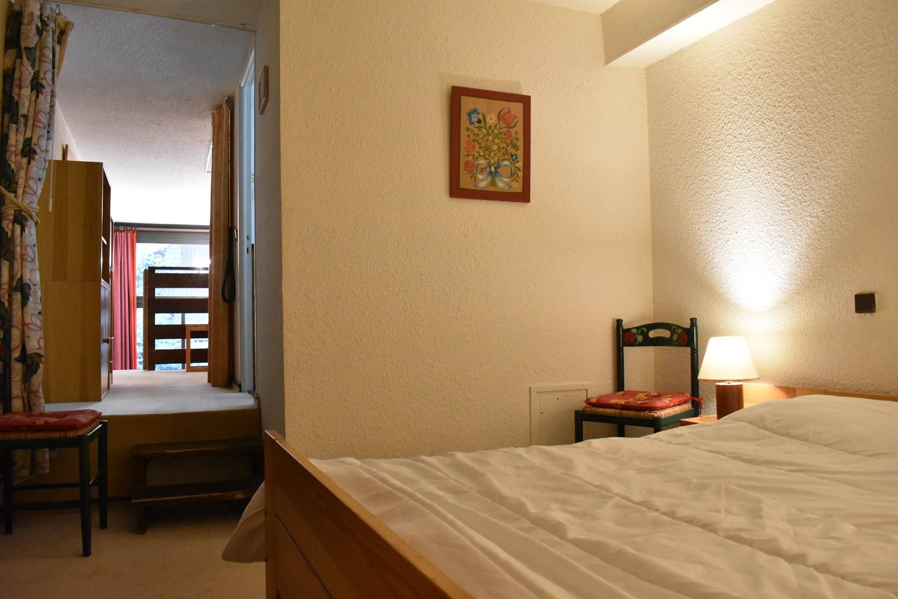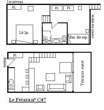 ( 5 étages à descendre sans ascenseur ) comprend une cuisine équipée ouverte sur un séjour/coin repas ( terrasse ouest) avec une télévision, une mezzanine avec un ensemble de lits superposés, une chambre ouverte sur la mezzanine avec 1 lit 2 personnes (160), une salle de douche avec wc, 1 casier à ski (C47).