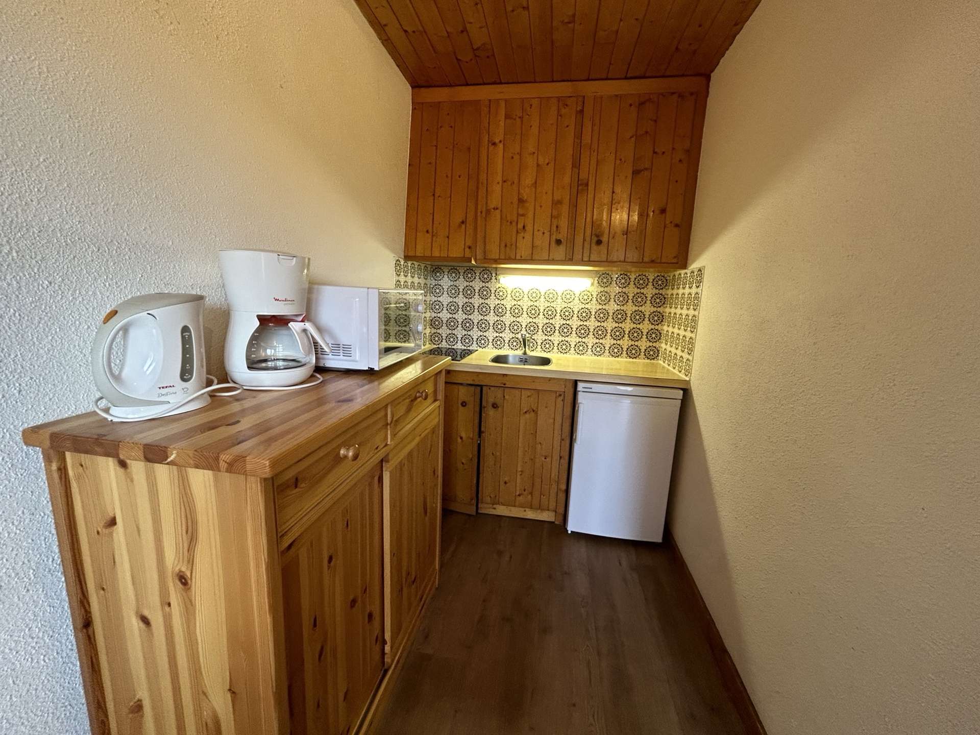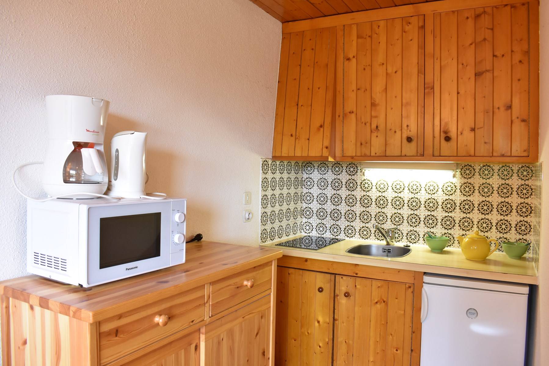 Cet appartement studio à la montagne situé au premier étage avec ascenseur, comprend un séjour avec un ensemble de lits gigognes relevables et télévision, une petite cuisine ouverte sur le séjour, 1 entrée avec un ensemble de lits superposés, 1 salle de bain, 1 WC indépendant.