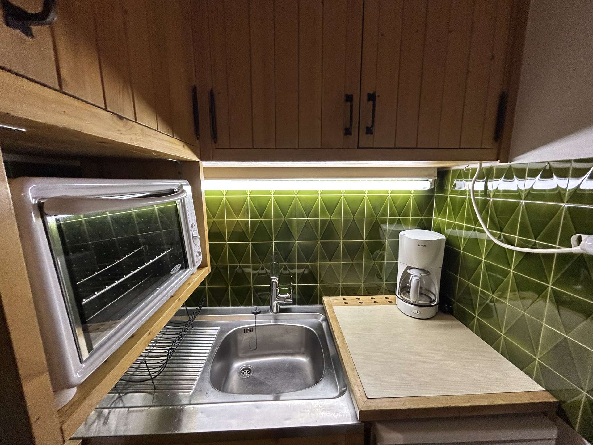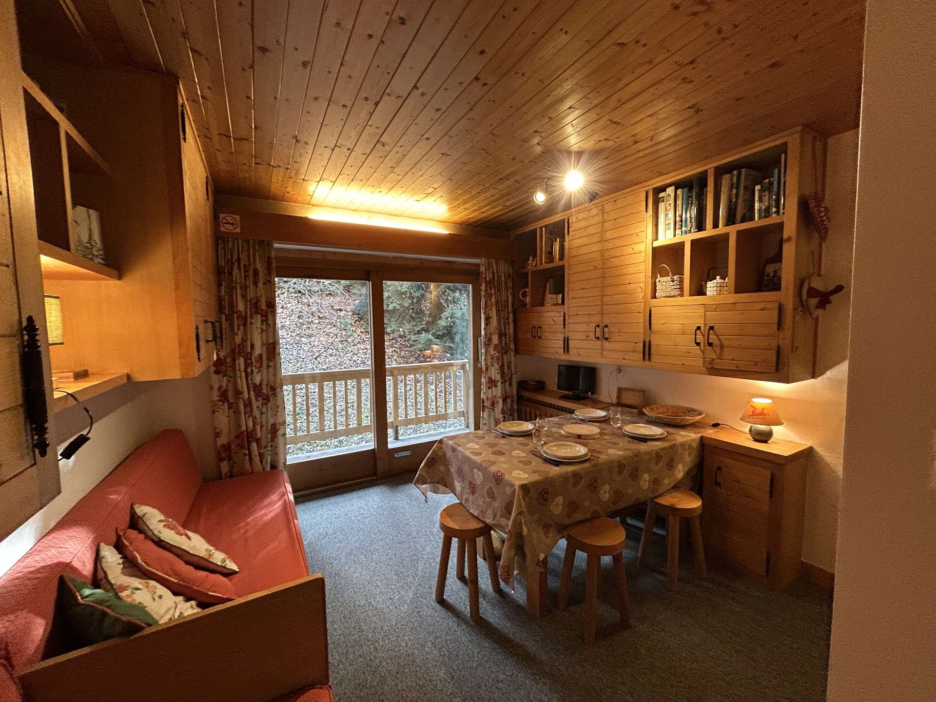 Ce Studio à la montagne, situé au rez de chaussée, comprend un séjour avec 2 lits 1 personne (80x180) et une télévision, une petite cuisine ouverte sur le séjour, une alcôve avec 1 lit simple bas (80x180) et 1 lit simple bas (80x180) dans le couloir, une salle d'eau et un WC indépendant.