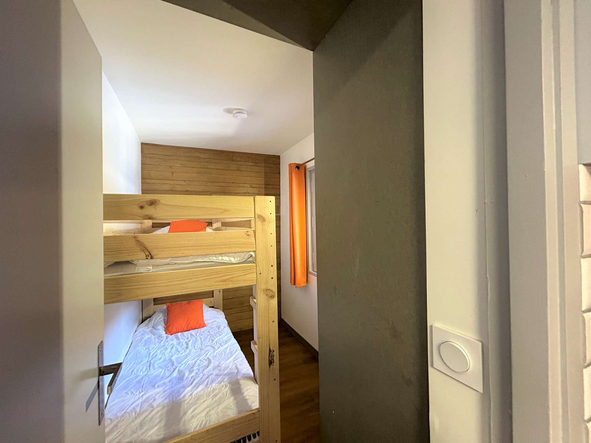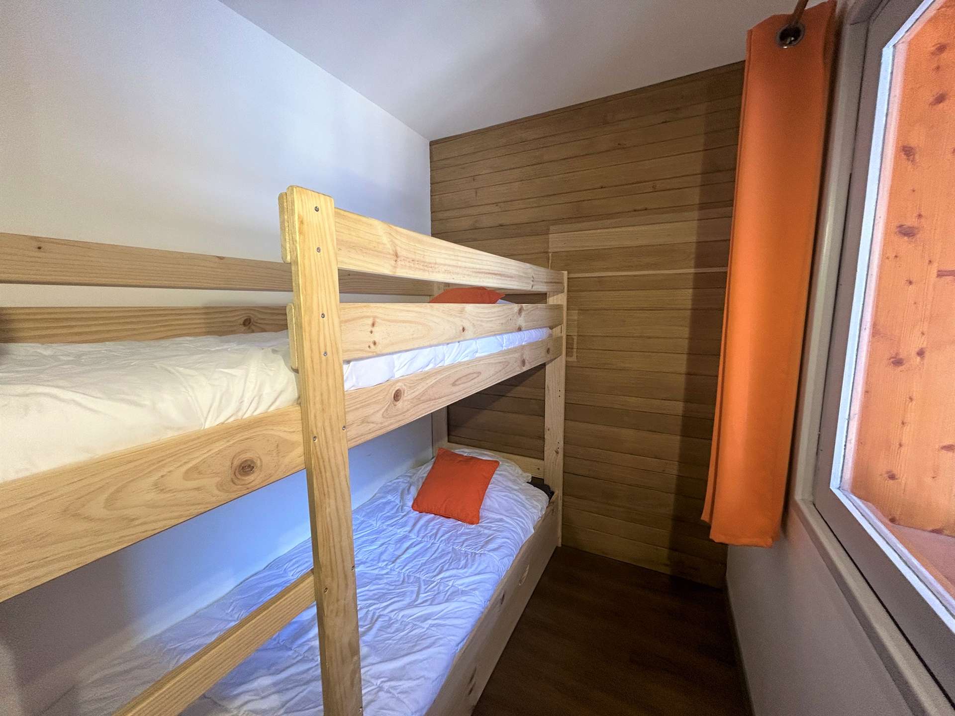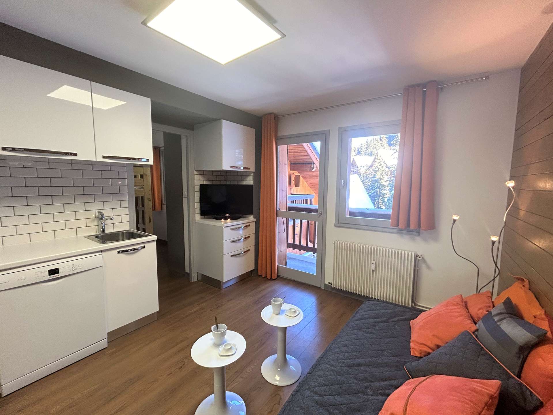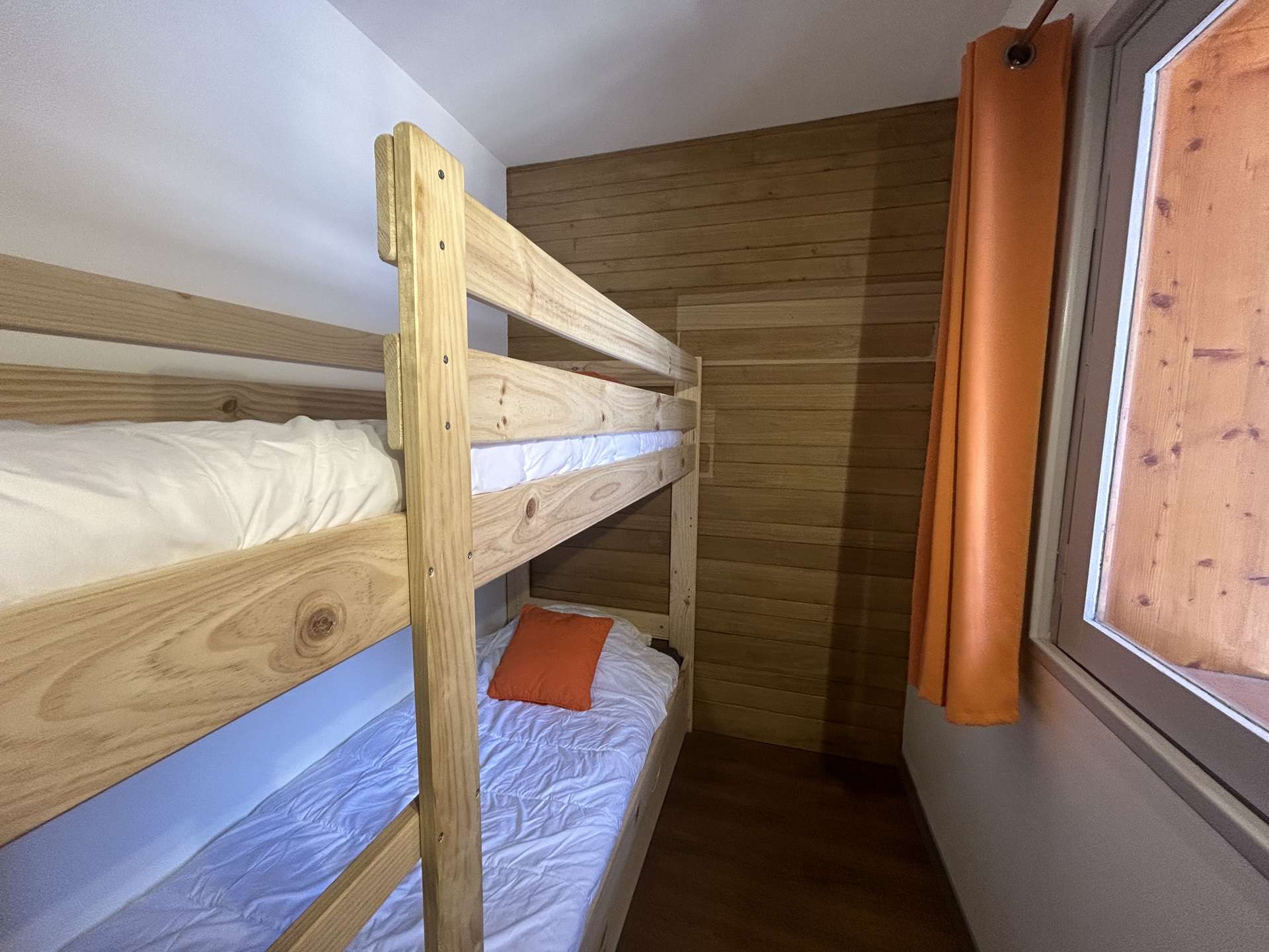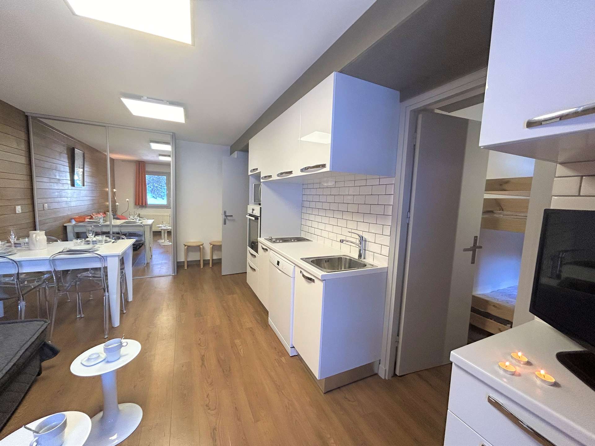 Cette location à la montagne, située au troisième étage par ascenseur, comprend un séjour/salle à manger avec un canapé lit 2 personnes(90x190), une télévision, un coin cuisine équipée, une chambre avec un ensemble de lits superposés (80x190), une salle de douche avec un wc.