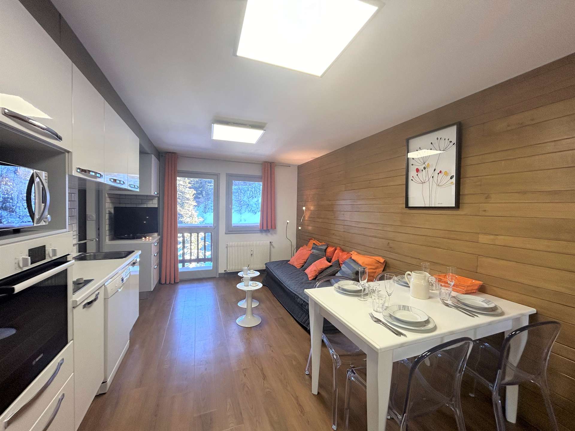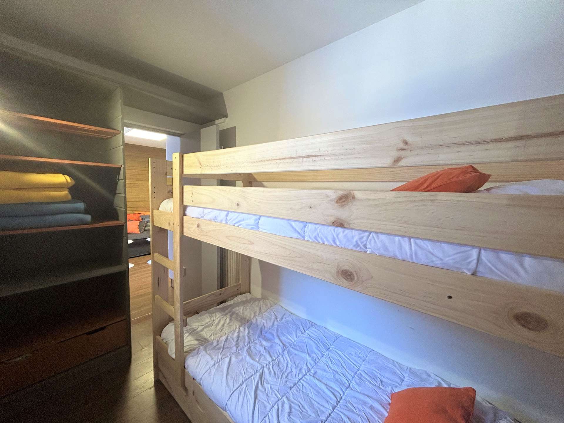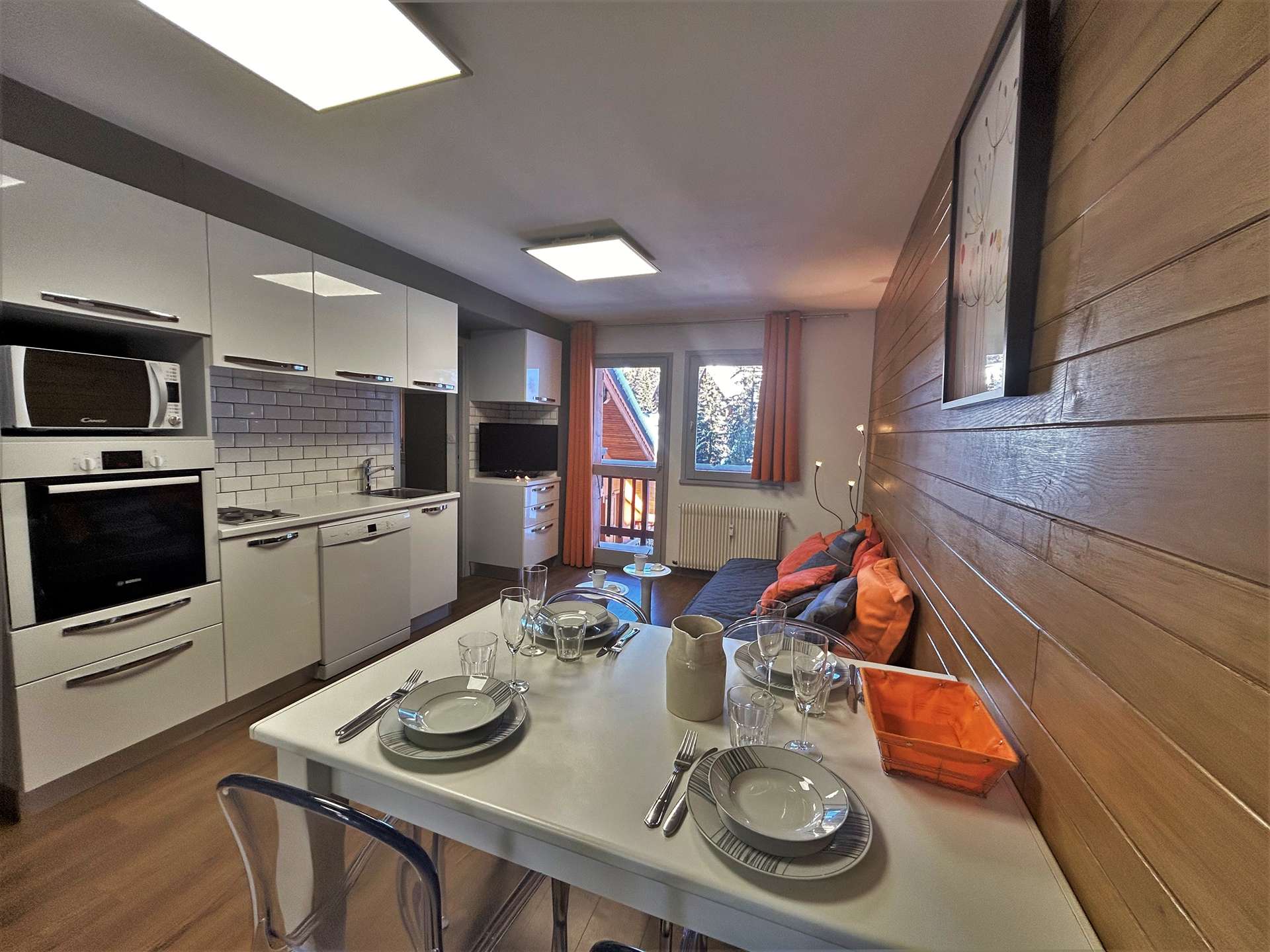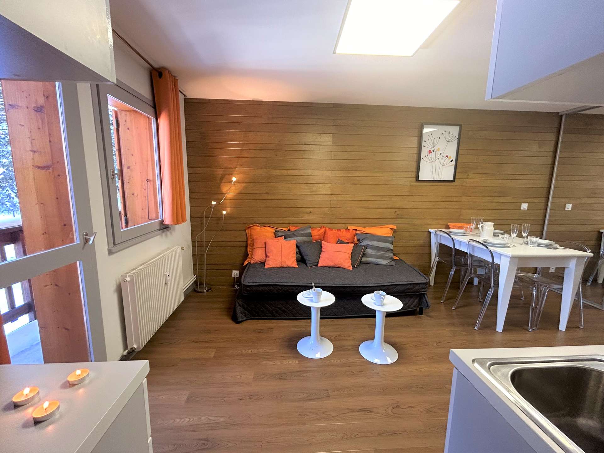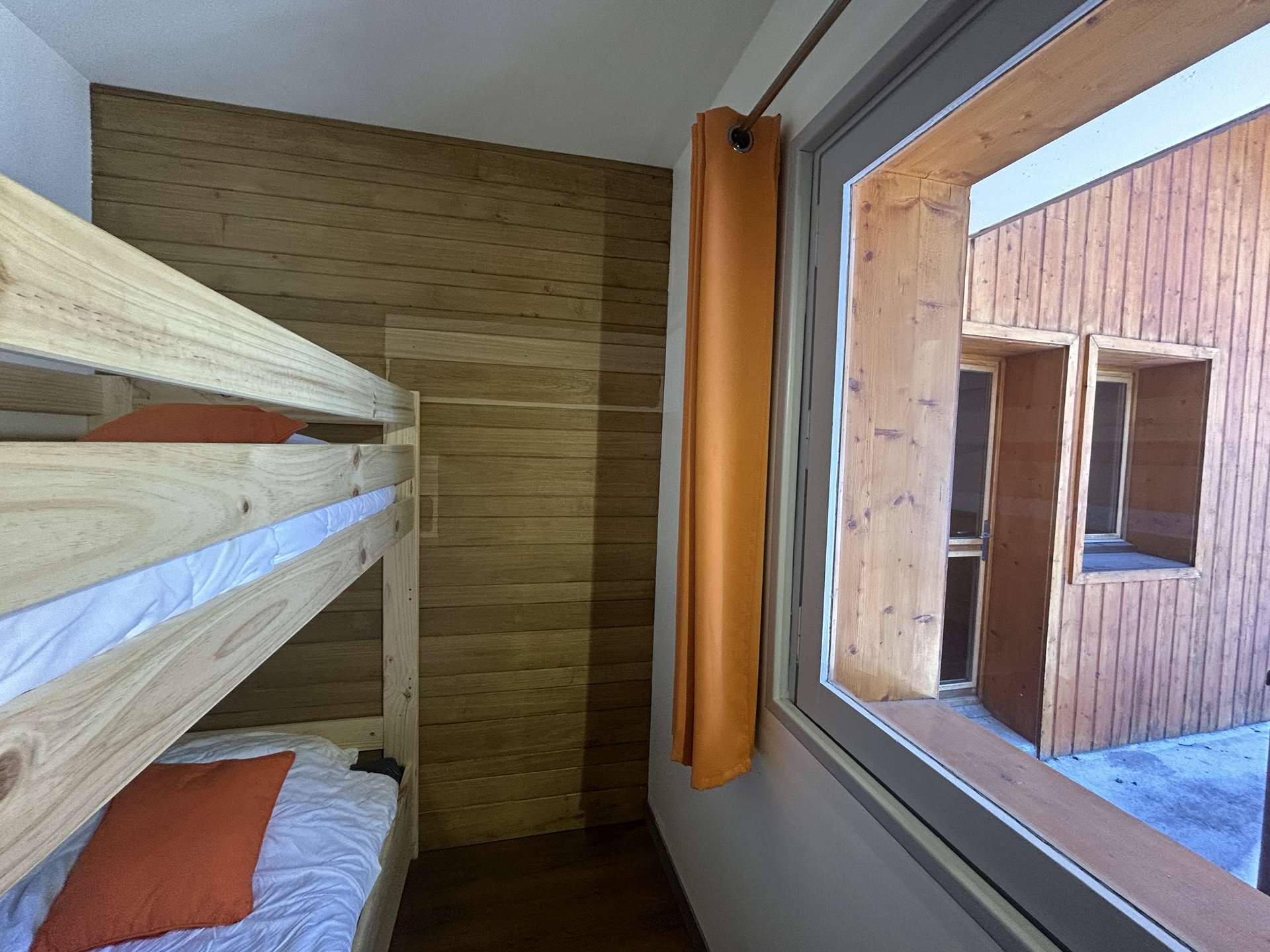 Cette location à la montagne, située au troisième étage par ascenseur, comprend un séjour/salle à manger avec un canapé lit 2 personnes(90x190), une télévision, un coin cuisine équipée, une chambre avec un ensemble de lits superposés (80x190), une salle de douche avec un wc.