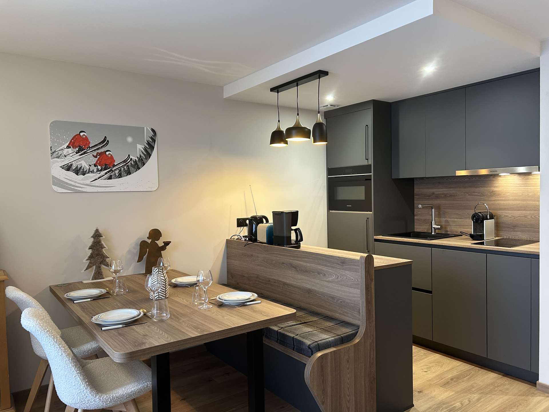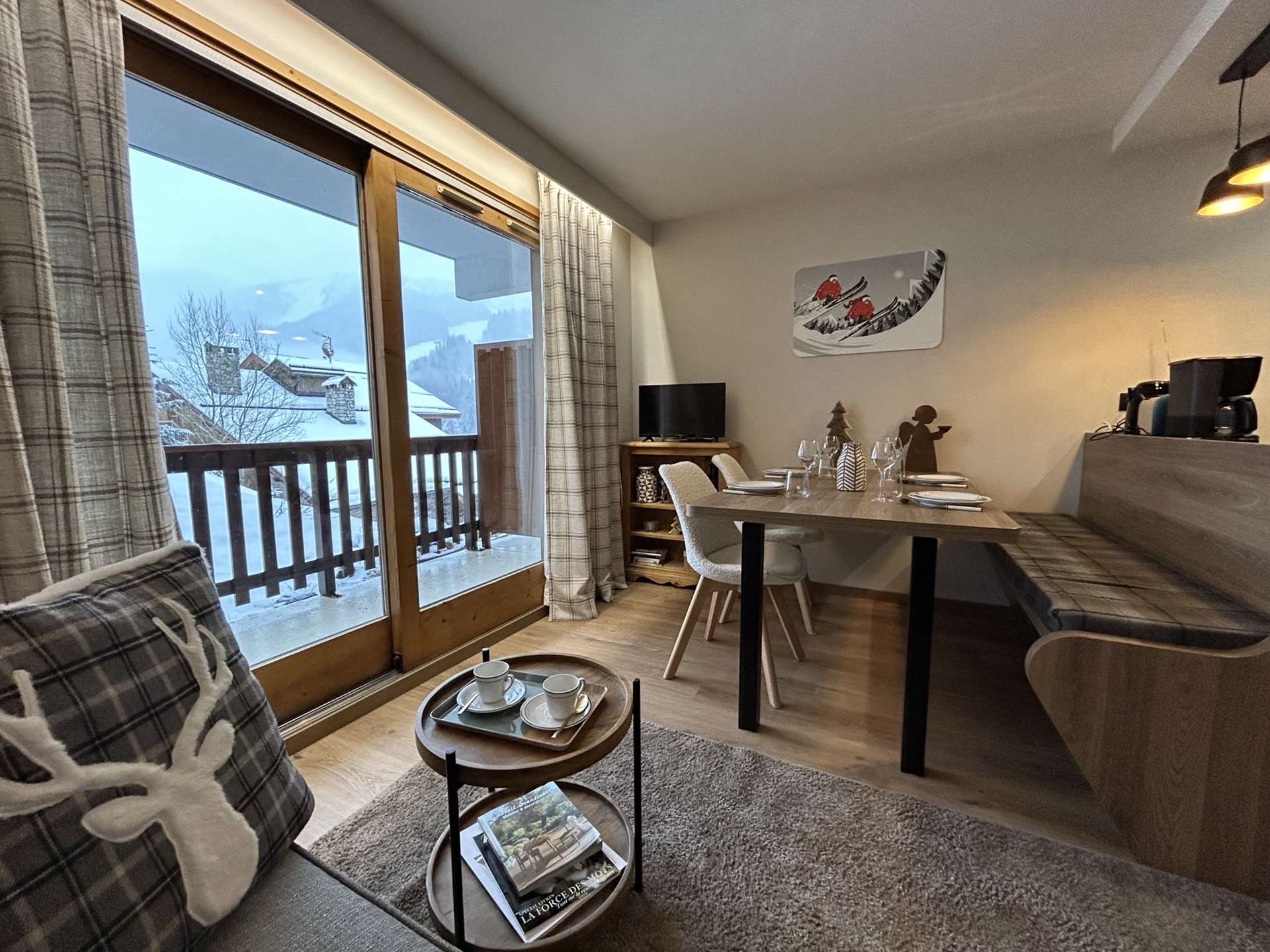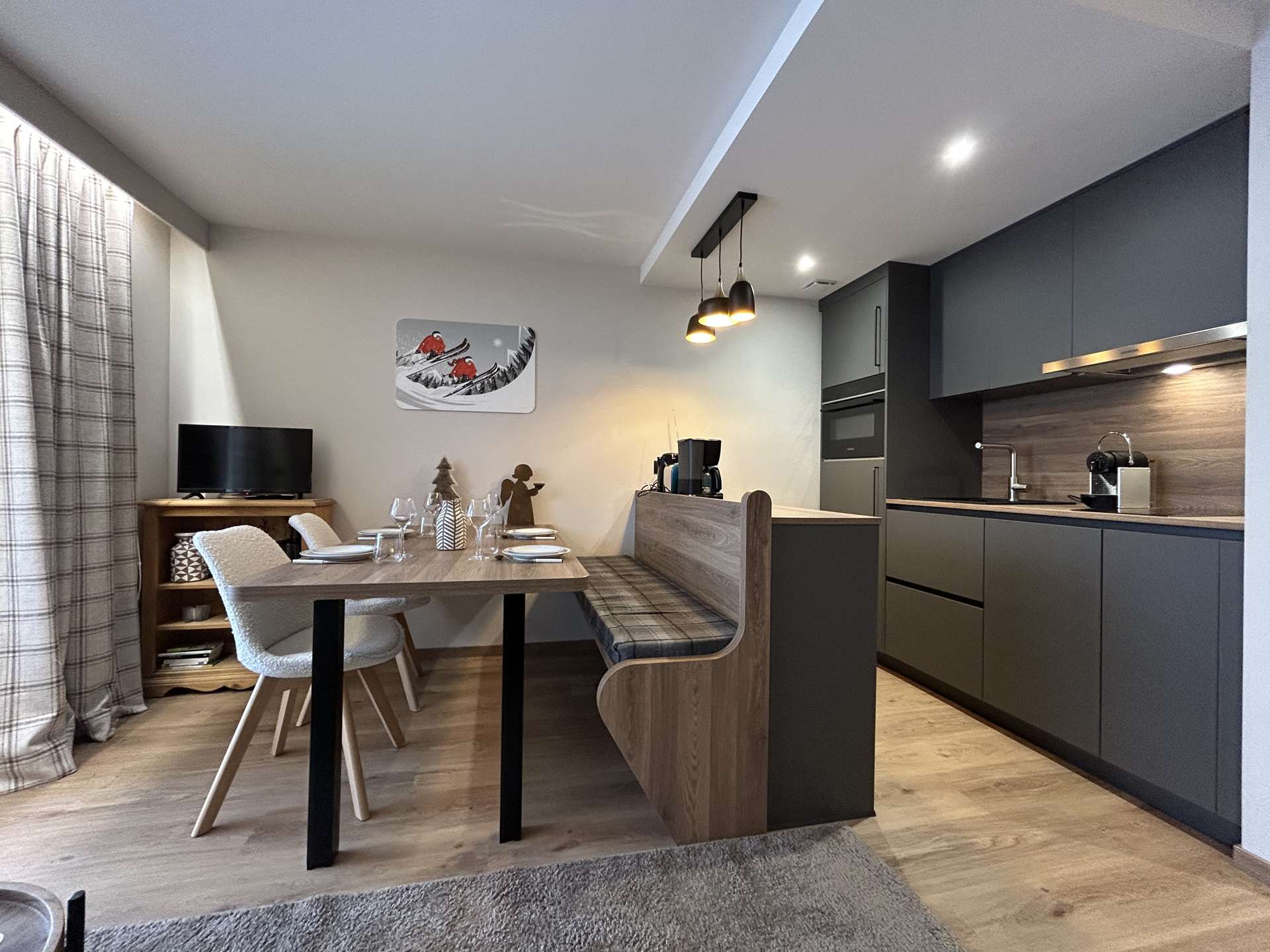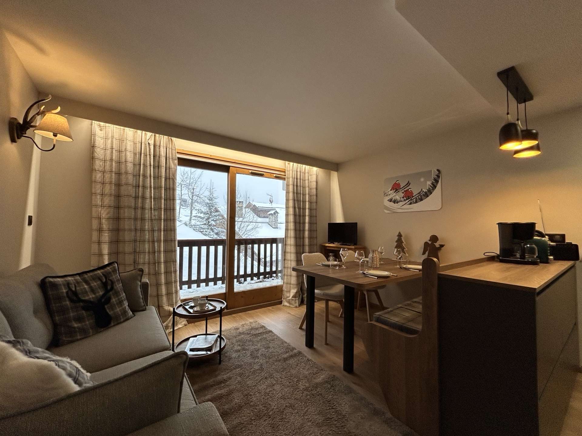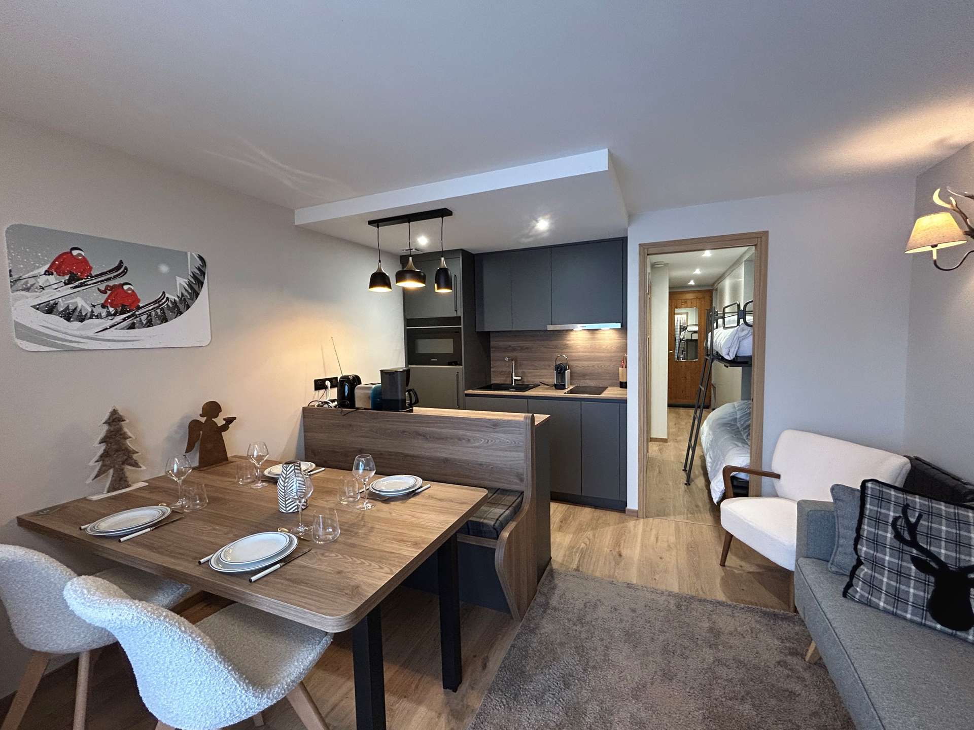 Ce bel appartement au style contemporain est situé au 3ème étage, avec ascenseur. Vous découvrirez une agréable pièce à vivre avec un balcon Sud, un salon avec un canapé et un espace repas très convivial disposant du wifi et de la télévision. La cuisine au design moderne est très bien équipée et ouverte sur le séjour. Au niveau de l'entrée, vous disposerez d'une chambre avec 1 lit 160x200, une salle d'eau avec WC et dans l'entrée 1 ensemble de lits abattants simples en 90x190 très confortables. "Le couchage en hauteur est interdit aux enfants de moins de 6 ans". Un casier à skis n°11 au niveau de l'entrée et une cave n°5 au 1er étage. Le LINGE DE MAISON et le MENAGE sont INCLUS dans cette location.