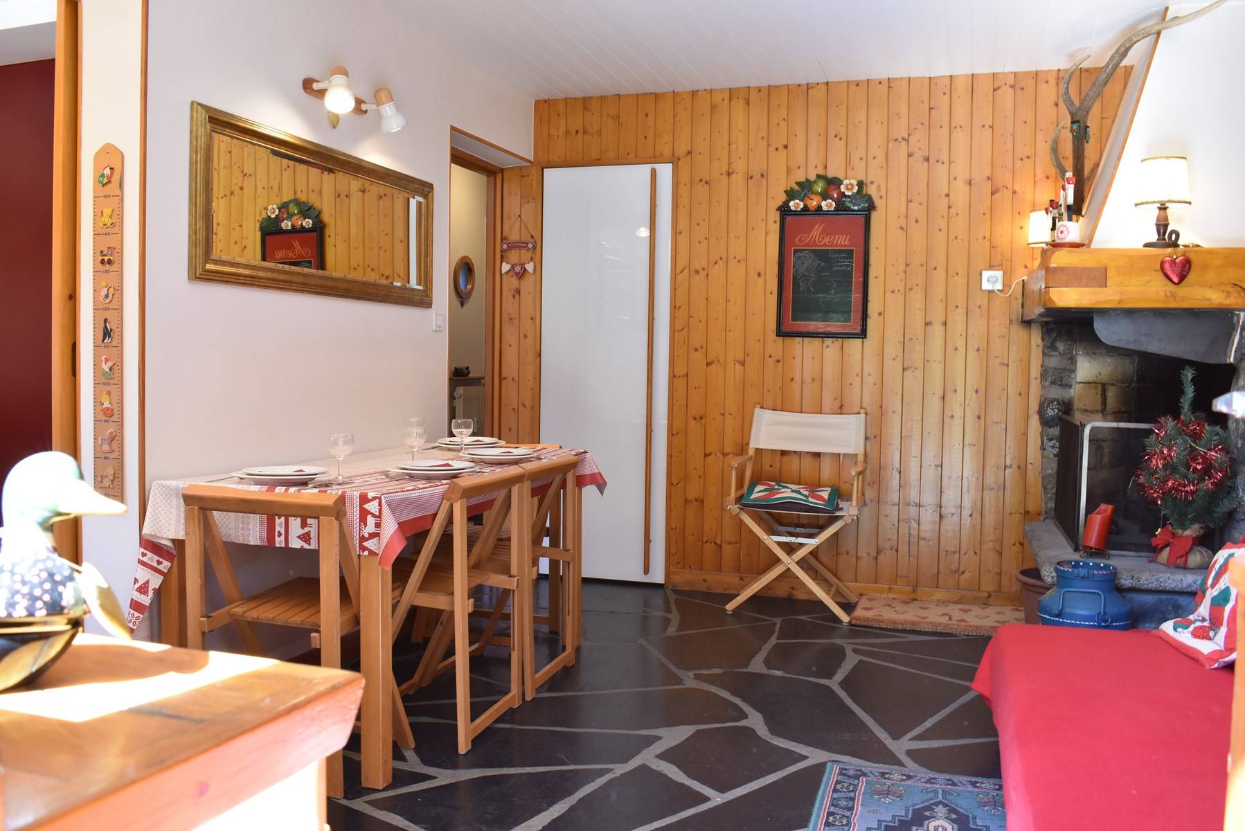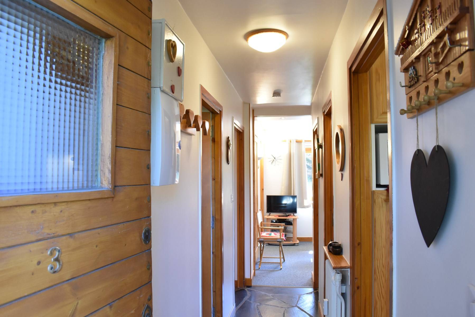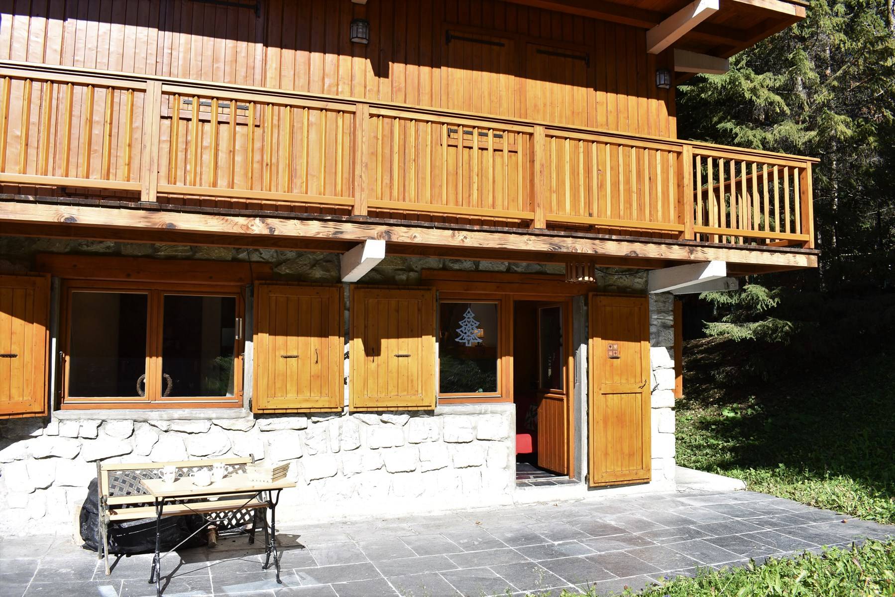 Les plus de cette location à la montagne : une cheminée, un coffre fort, une terrasse en rez de jardin exposé Sud et un casier à ski ainsi que le wi-fi dans l'appartement.