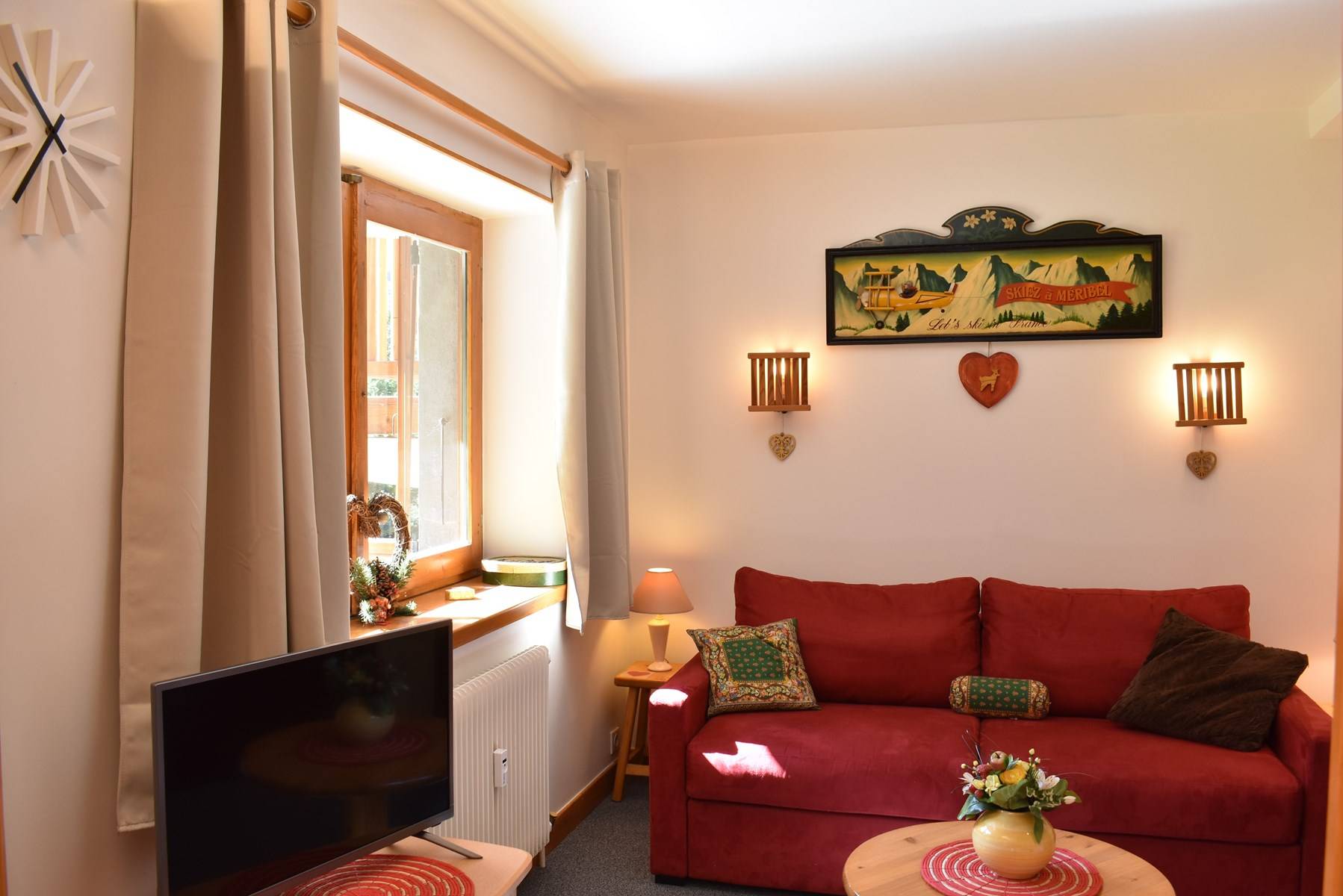 Situé dans le secteur de l’altitude 1600, à 250 mètres d’un accès aux pistes, cet appartement de vacances dans les 3 vallées, en rez de jardin (étage 1 depuis l’entrée), sans ascenseur, comprend, 1 séjour avec télévision avec lecteur DVD séparé par une paroi coulissante en bois avec d’un côté un coin repas, cheminée et une banquette 1 personne (120) et de l’autre côté 1 canapé lit 2 personnes (160). Cette location comporte une cuisine fermée et équipée avec lave-vaisselle, 1 chambre avec deux lits de 80x190 pouvant se rapprocher et faire un couchage en 160, une salle de bains et un wc indépendant.