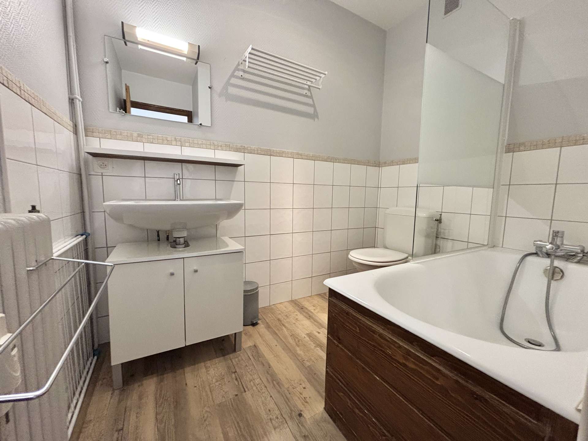 Ce studio de 26 m² situé en rez-de-chaussée comprend une entrée, une salle de bain avec WC, un lit gigogne, un lit simple et une cuisine type kitchenette équipée.