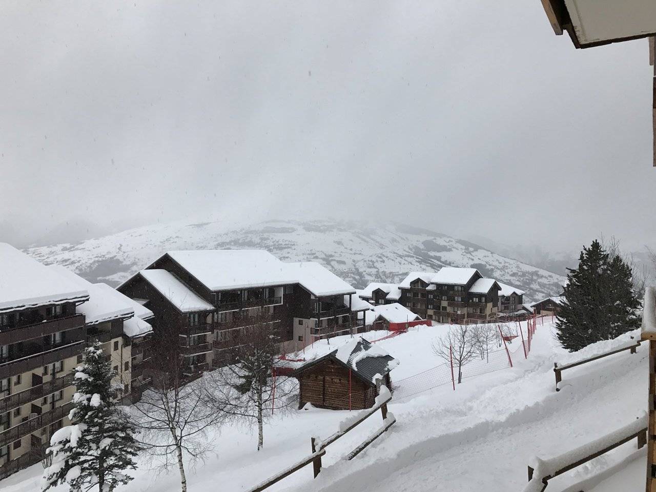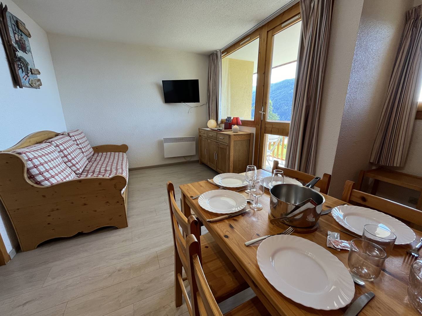 Studio pour 4 personnes de 26 m², entièrement rénové, situé au 1er étage avec balcon (niveau -1 par rapport à l'entrée haute de la résidence), sans ascenseur, en exposition Ouest et bénéficiant de la proximité du centre de la station et des pistes