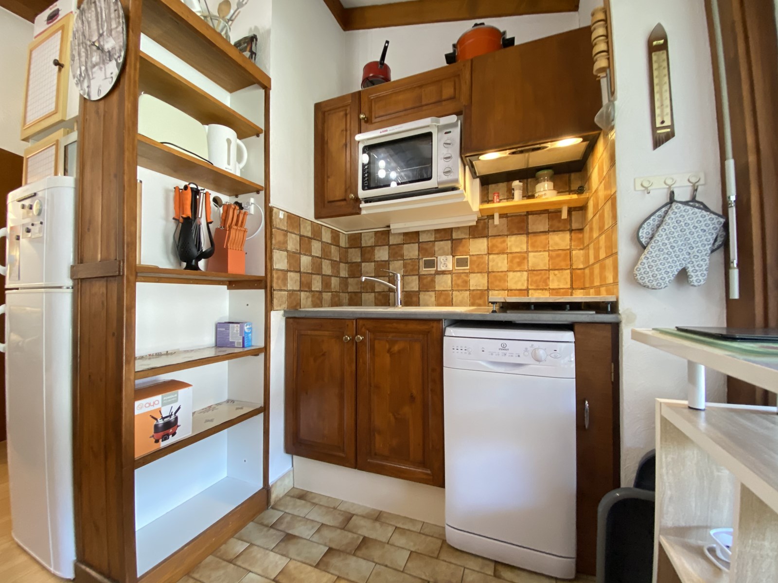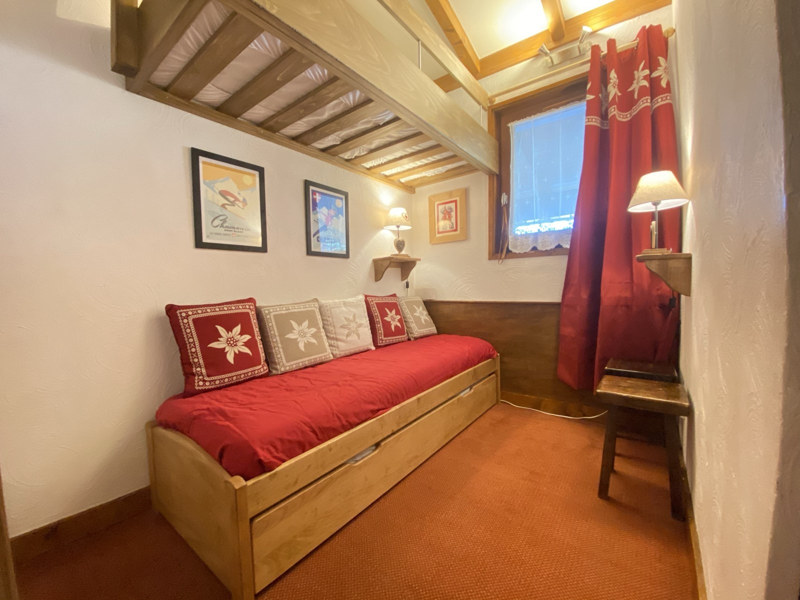 Cet appartement de vacances se compose d'une entrée, d'une chambre avec 3 lits simples et un lit gigogne, d'un salon/séjour avec un canapé lit tiroir, d'un coin cuisine équipé, d'une mezzanine avec lit double pour deux personnes, d'une salle d'eau avec douche et d'un WC indépendant.