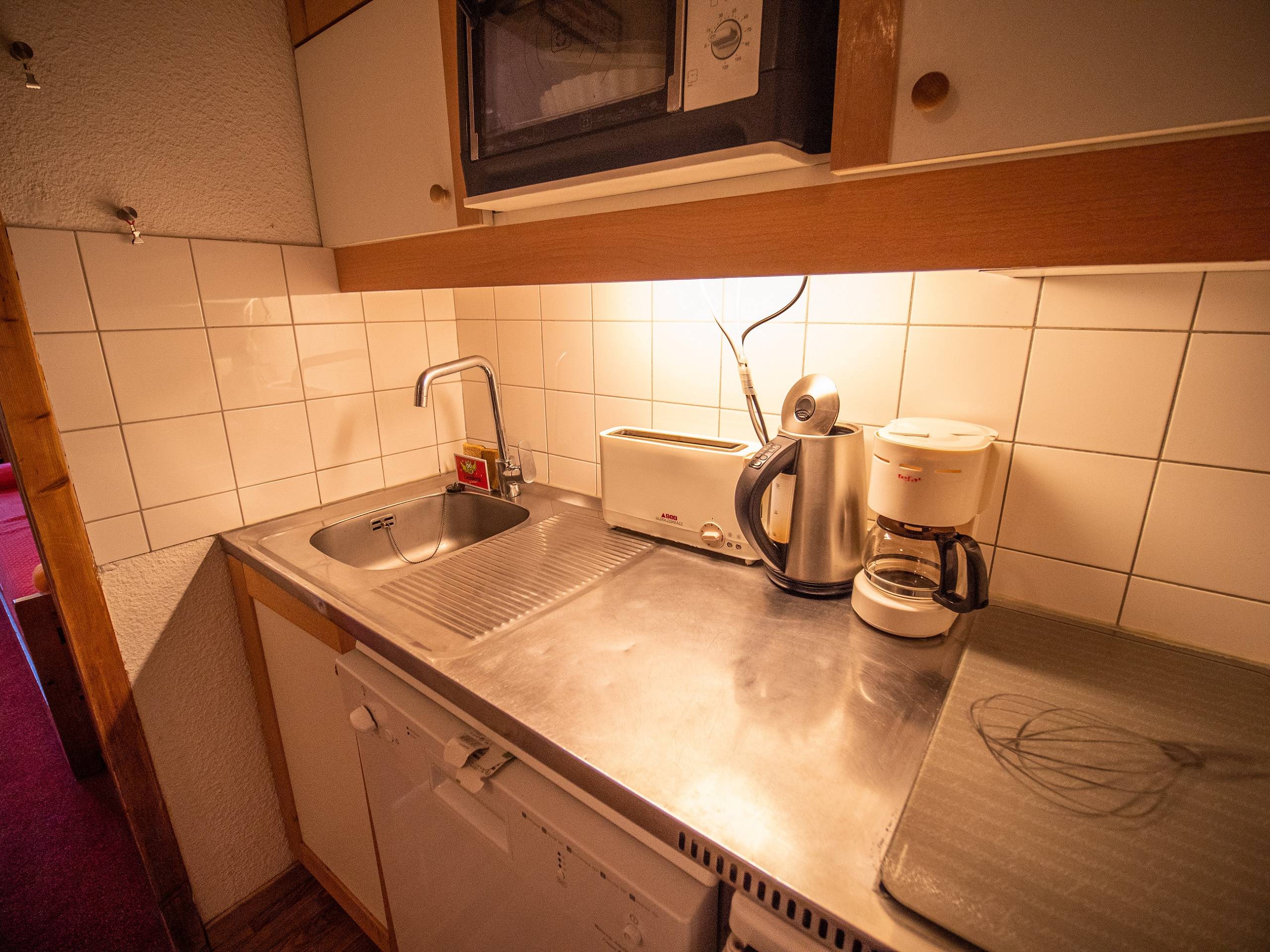 - Cuisine ouverte équipée de plaques vitrocéramiques, mini-four, four, lave-vaisselle, réfrigérateur, cafetière filtre, bouilloire, grille-pain.