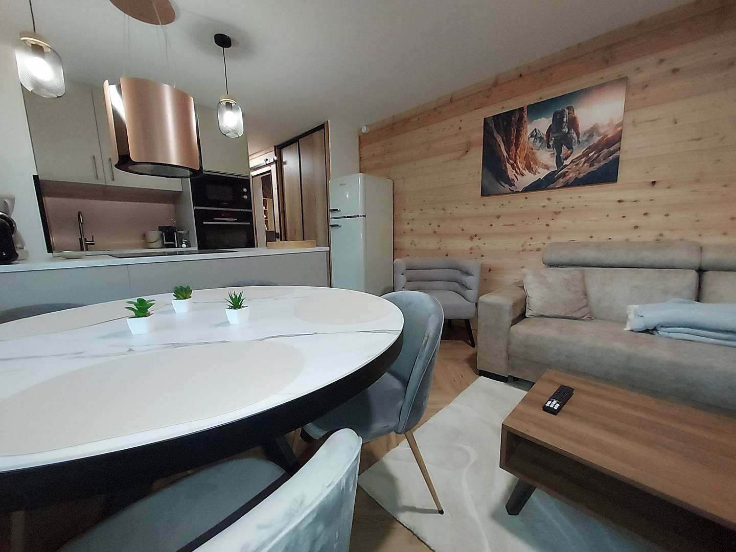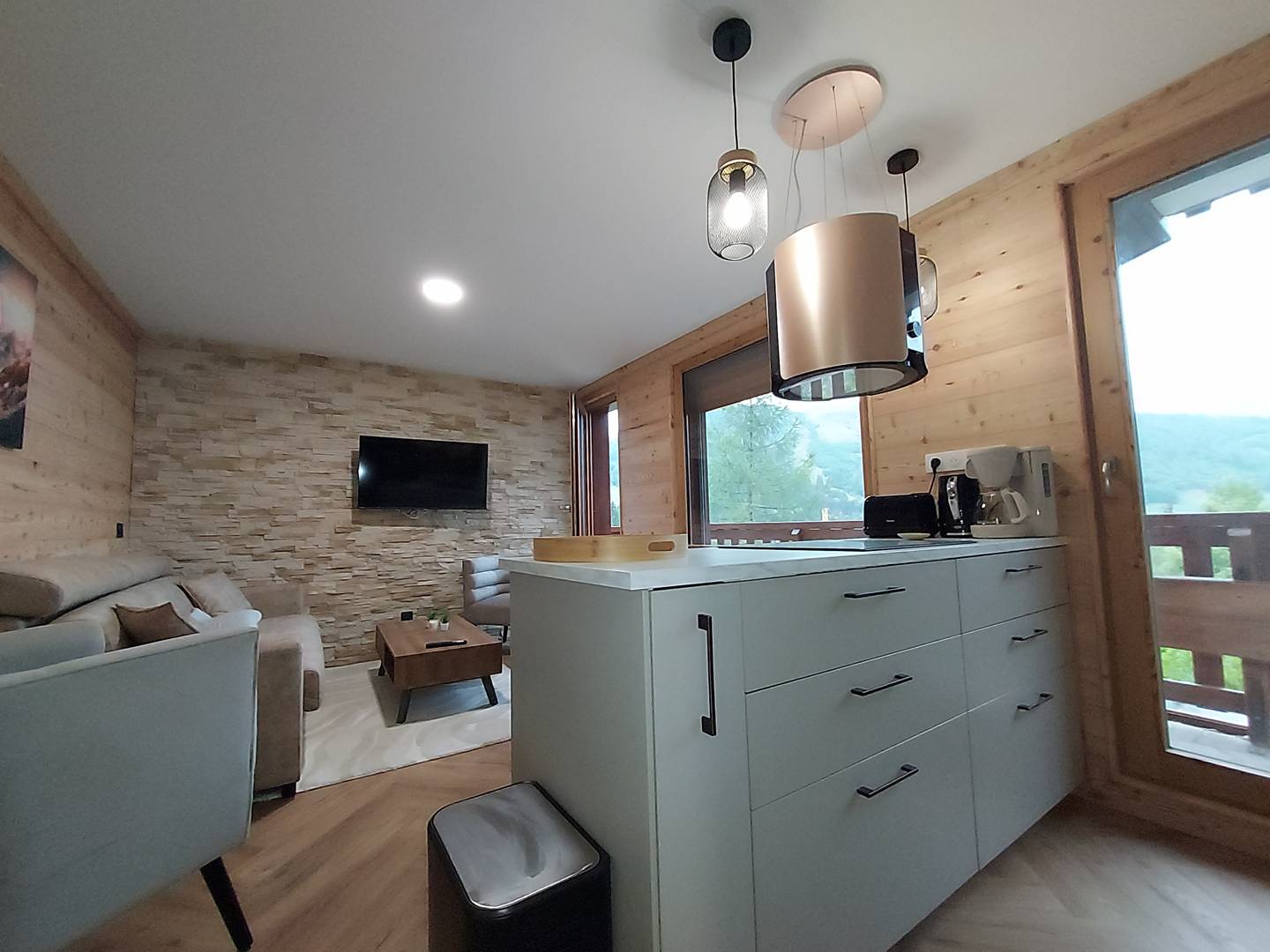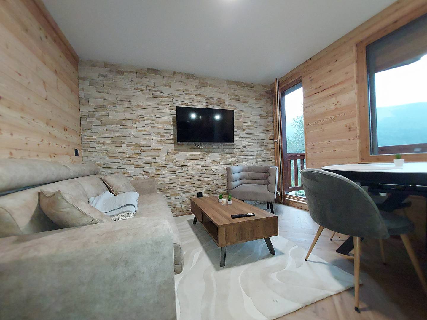 Salon cosy avec télévision, espace repas et accès à un balcon aménagé offrant une vue panoramique sur la vallée