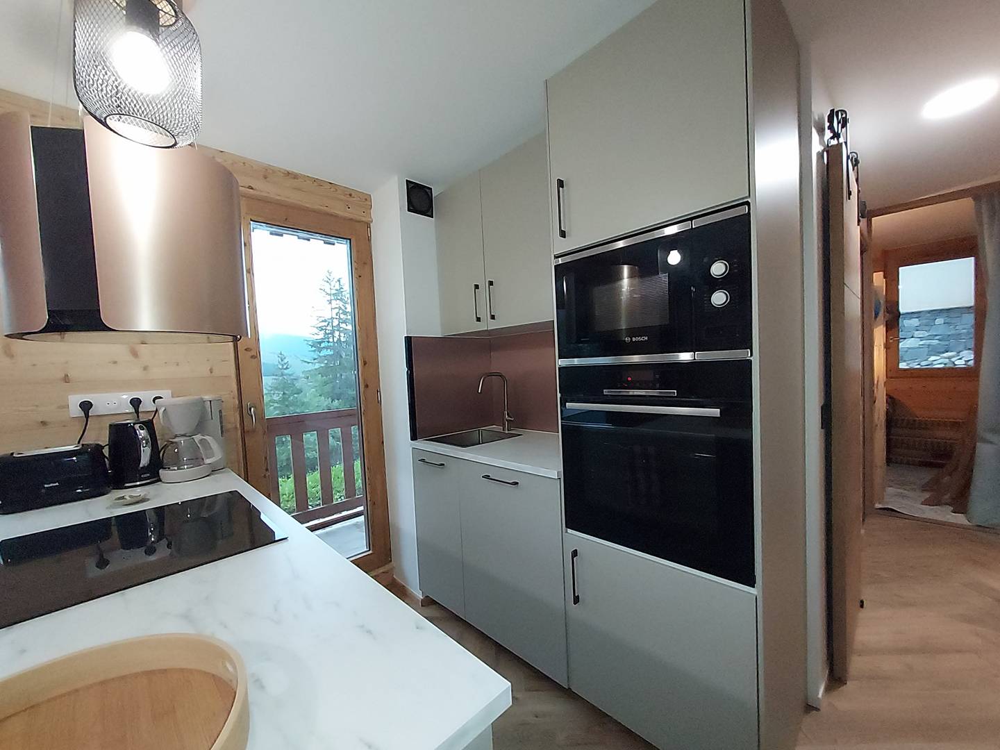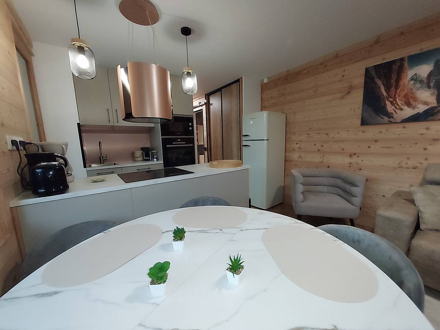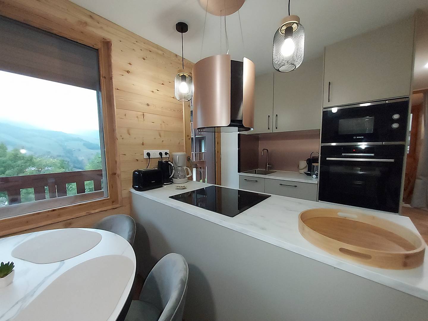 Cuisine américaine entièrement équipée : 3 plaques induction, four, lave-vaisselle, hotte, réfrigérateur avec congélateur
