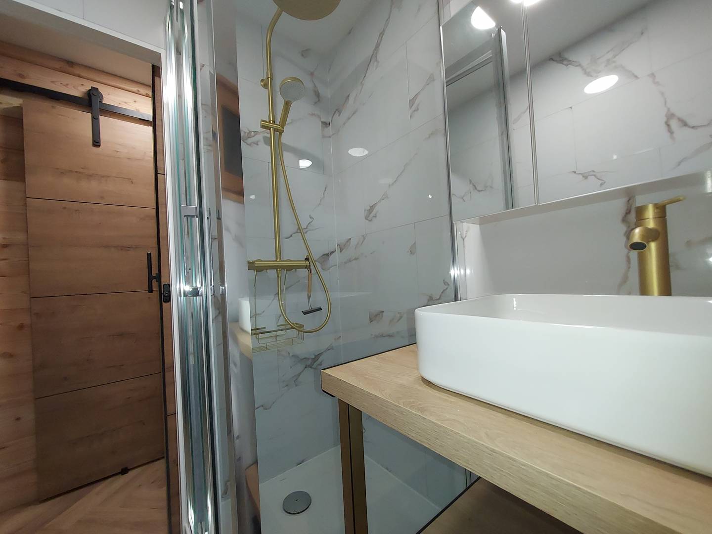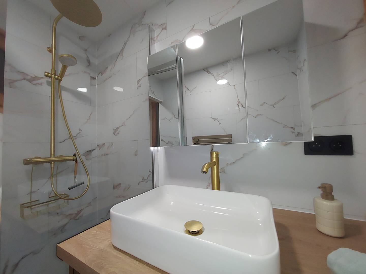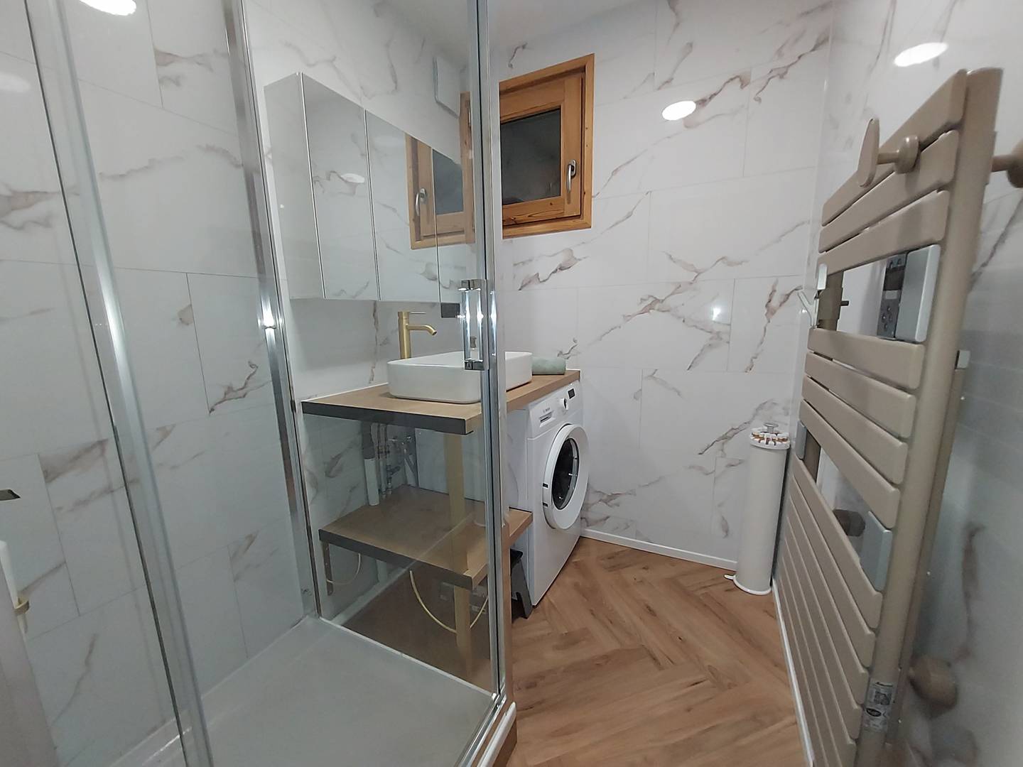 Salle de douche moderne avec lave-linge et sèche-serviettes